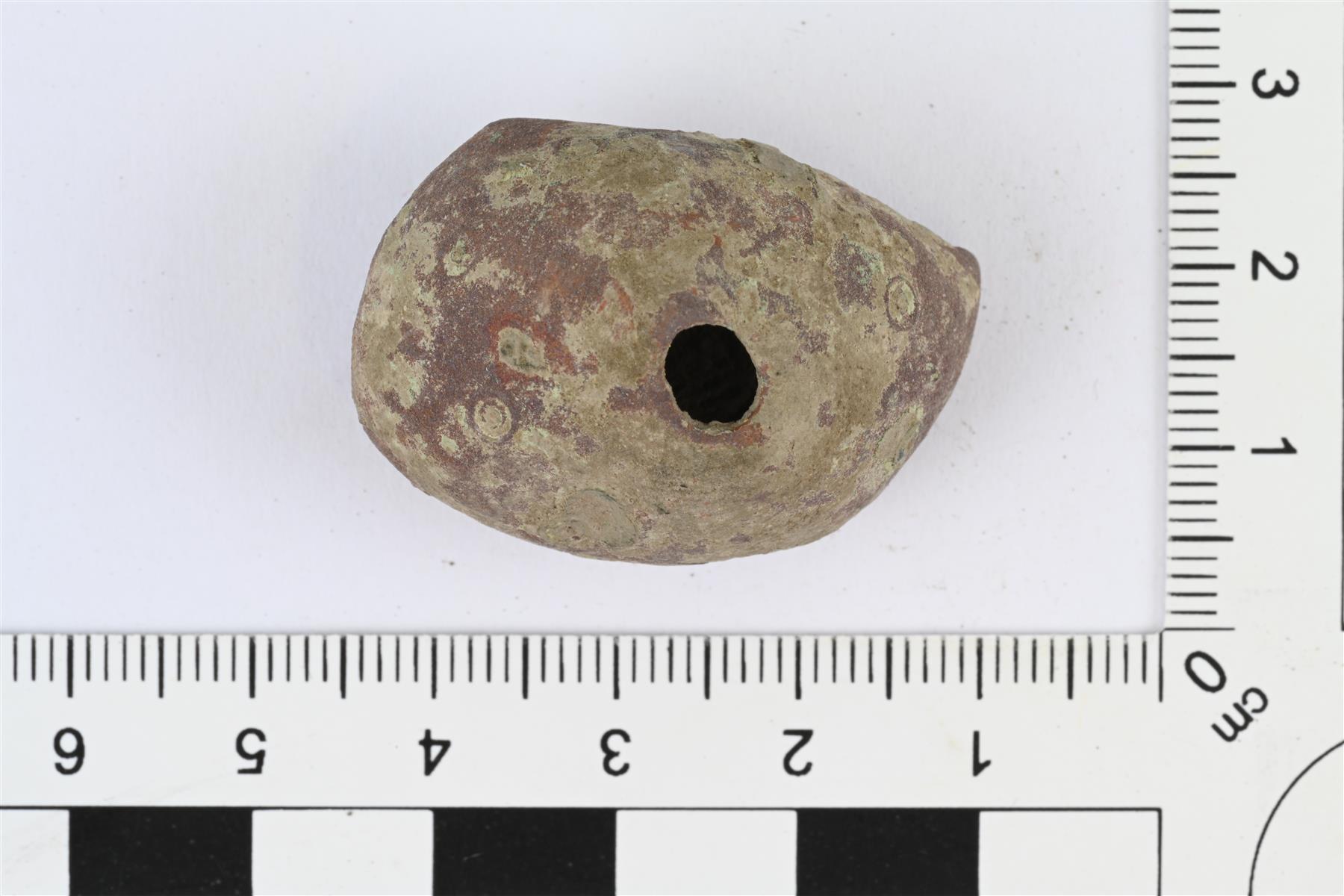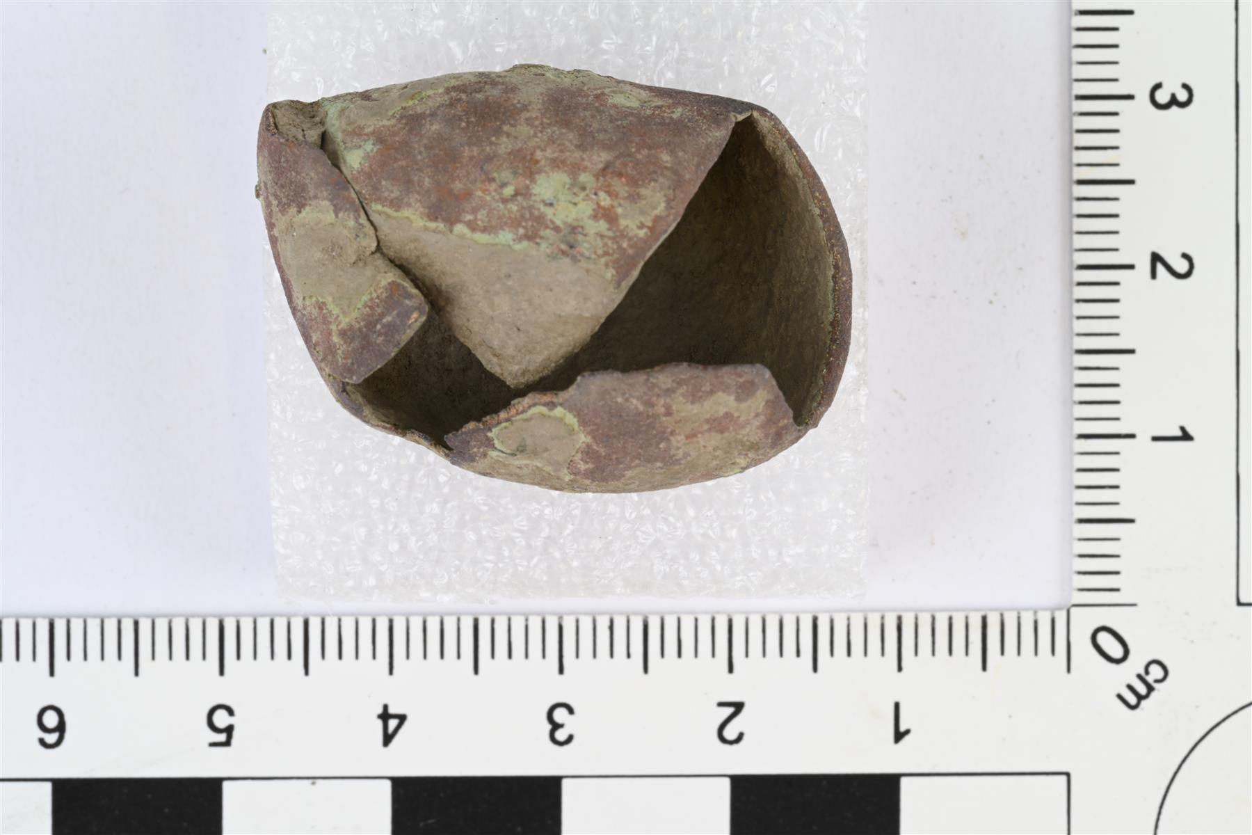 | Suurehko kulkunen. Vääntynyt ja alaosasta lytyssä. Vaipan yläosa kartiomainen. Alaosassa neljä lehdykkää, joista yksi katkennut kokonaan pois ja kahdesta kärki murtunut. Vaipan laella ei ripustussilmukkaa vaan pyöreä reikä. Pinnassa häränsilmäleimoja. Halkaisija vääntyneenä 23-35 mm. Ei vastaa mitään Rainion (2010) rautakautista kulkustyyppiä. | |