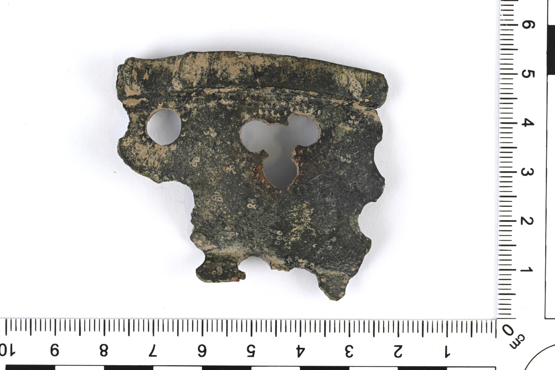 | Kupariseoksisen astian katkelma. Koristeluna reikäkuviointia. Mahdollisesti suitsutusastiasta. | |