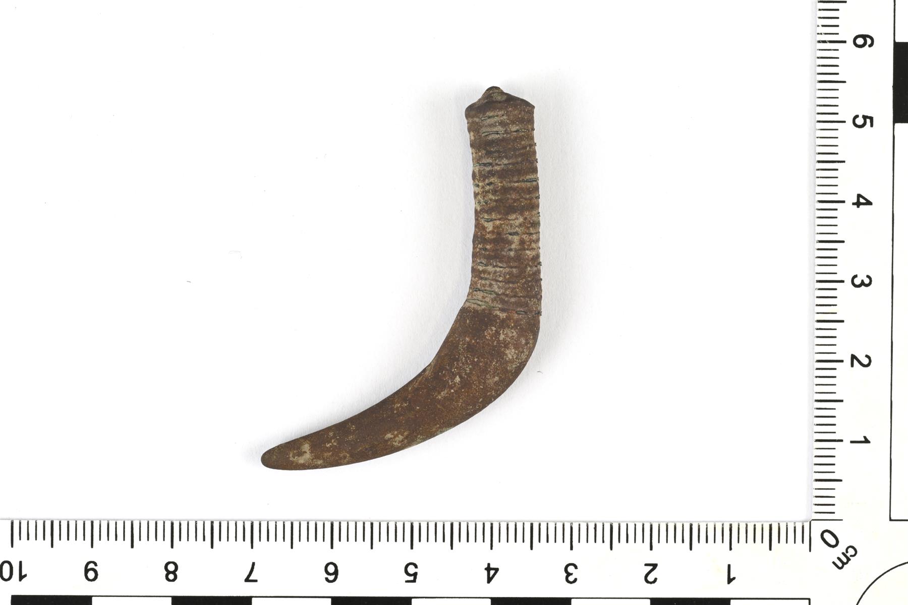 | Melkein kokonaisena säilynyt karhunhammasriipus. Ripustuslenkki on hajonnut ja pinta on melko kulunut. Yläosassa on koristeluna poikittaisia viivauurteita ja alaosassa on tunnistettavissa häränsilmäleima. | |