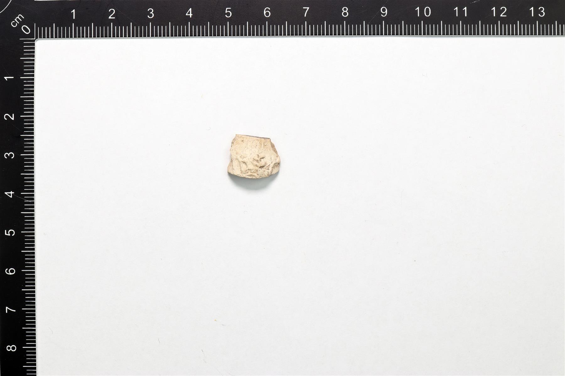 | Pieni katkelma liitupiipun kopasta. Ulkopinnalla on katkelmallinen kruunua esittävä kohokuvio. | |