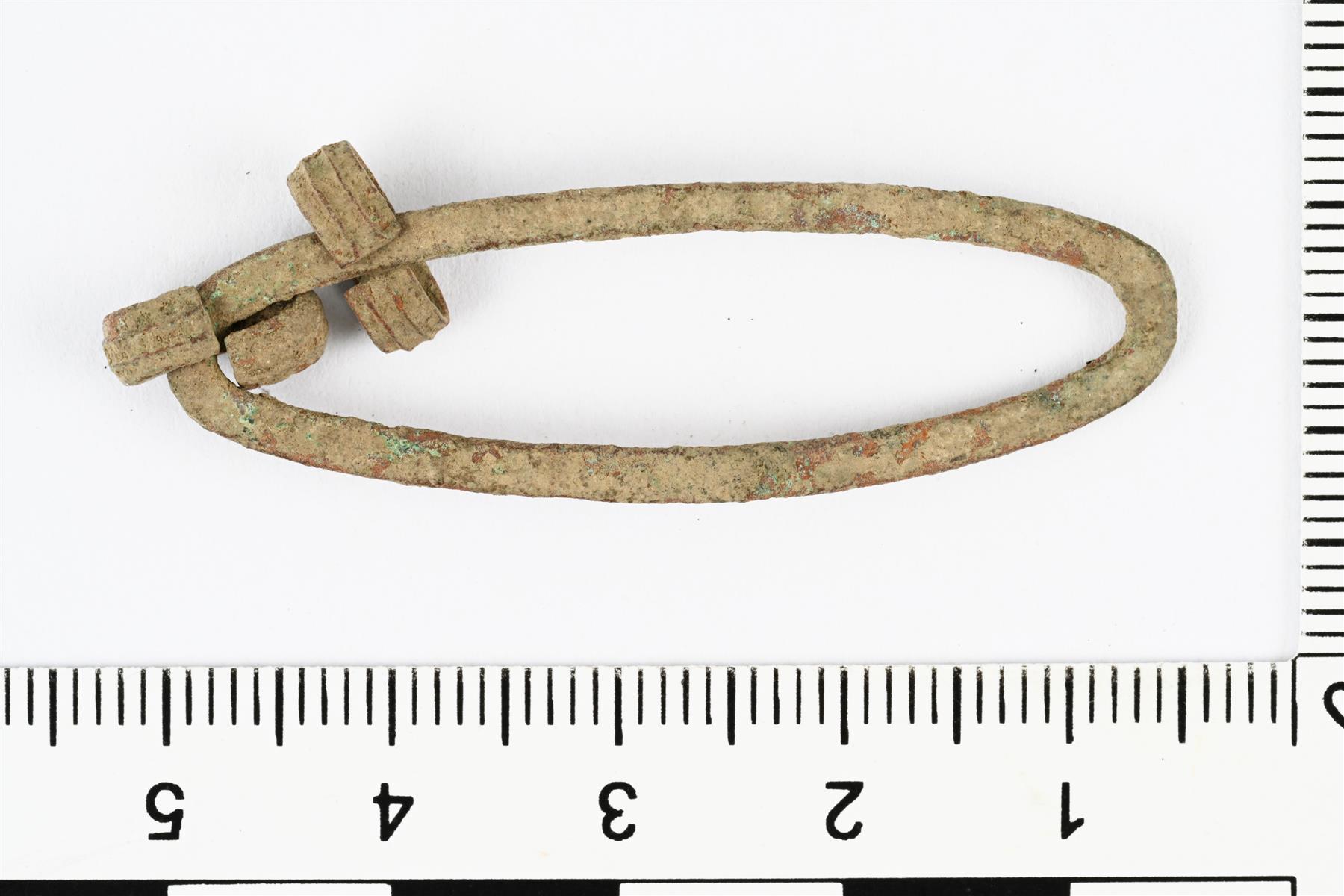 | Tunnistamattoman koruesineen katkelma. Muodoltaan ovaalinmuotoinen kehä, jossa on kaksi kupariseospellistä tehtyä lenkkiä. | |