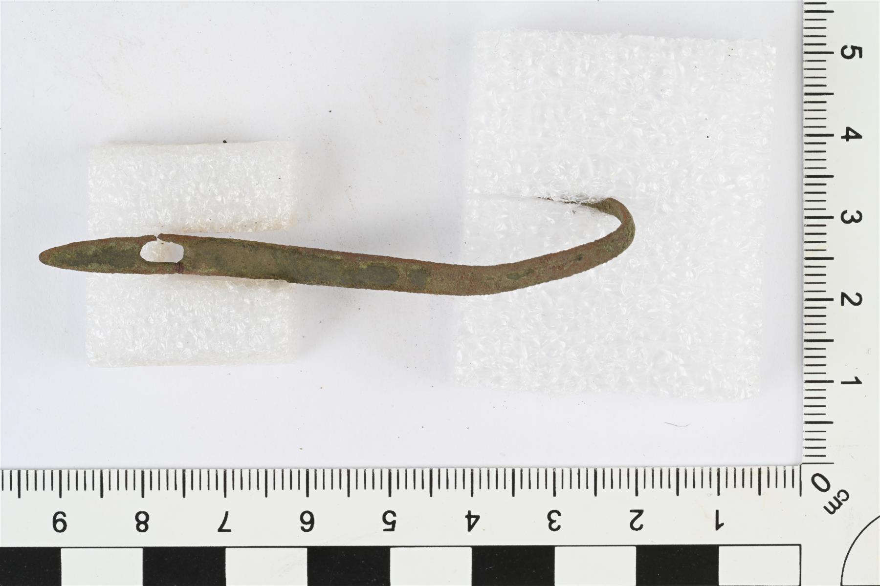 | Silmäneula. Teräväkärkinen, myös toinen pää silmän yläpuolella suippeneva. Pitkänomainen soikea silmä, jonka toinen sivu murtunut. Vääntynyt, mahdollisesti tarkoituksella taivutettu koukuksi. Alkuperäinen pituus noin 95 mm. | |