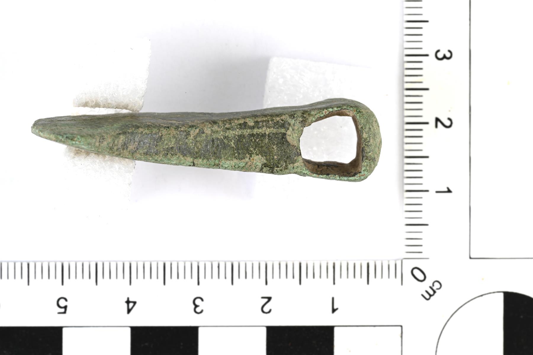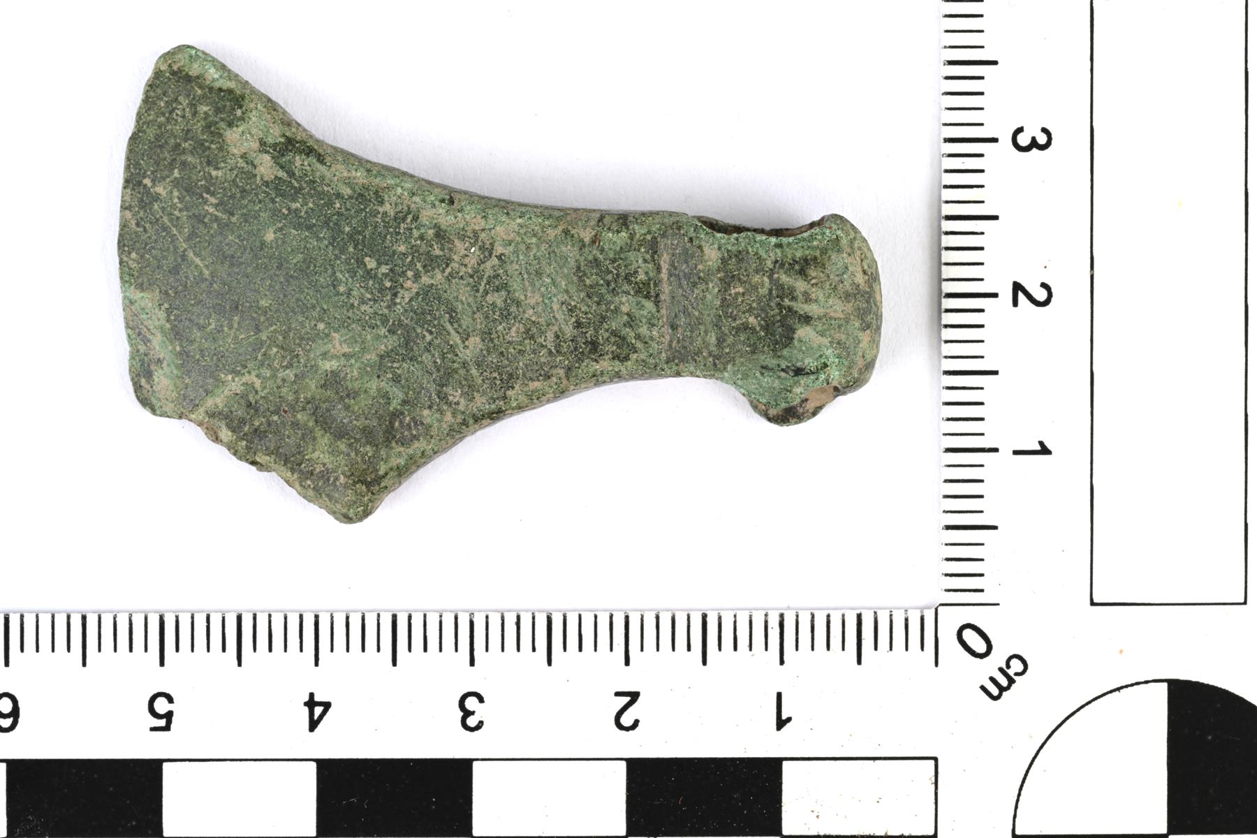 | Kirvesriipus, jonka terän alaosa on hajonnut. Hamara on kaareva ja silmän alaosassa on lyhyet pielukset. Silmä on muodoltaan etuosasta kapeampi suorakaide. Terä kaartuu sekä ylä- että alasivulta ulospäin teränsuuta kohti. Muoto on lähempänä Makarovin tyypin 1 kirvesriipuksia. Ks. lisää Kucypera & Wadyl Fig. 1 ja Jensen s. 43-45. | |