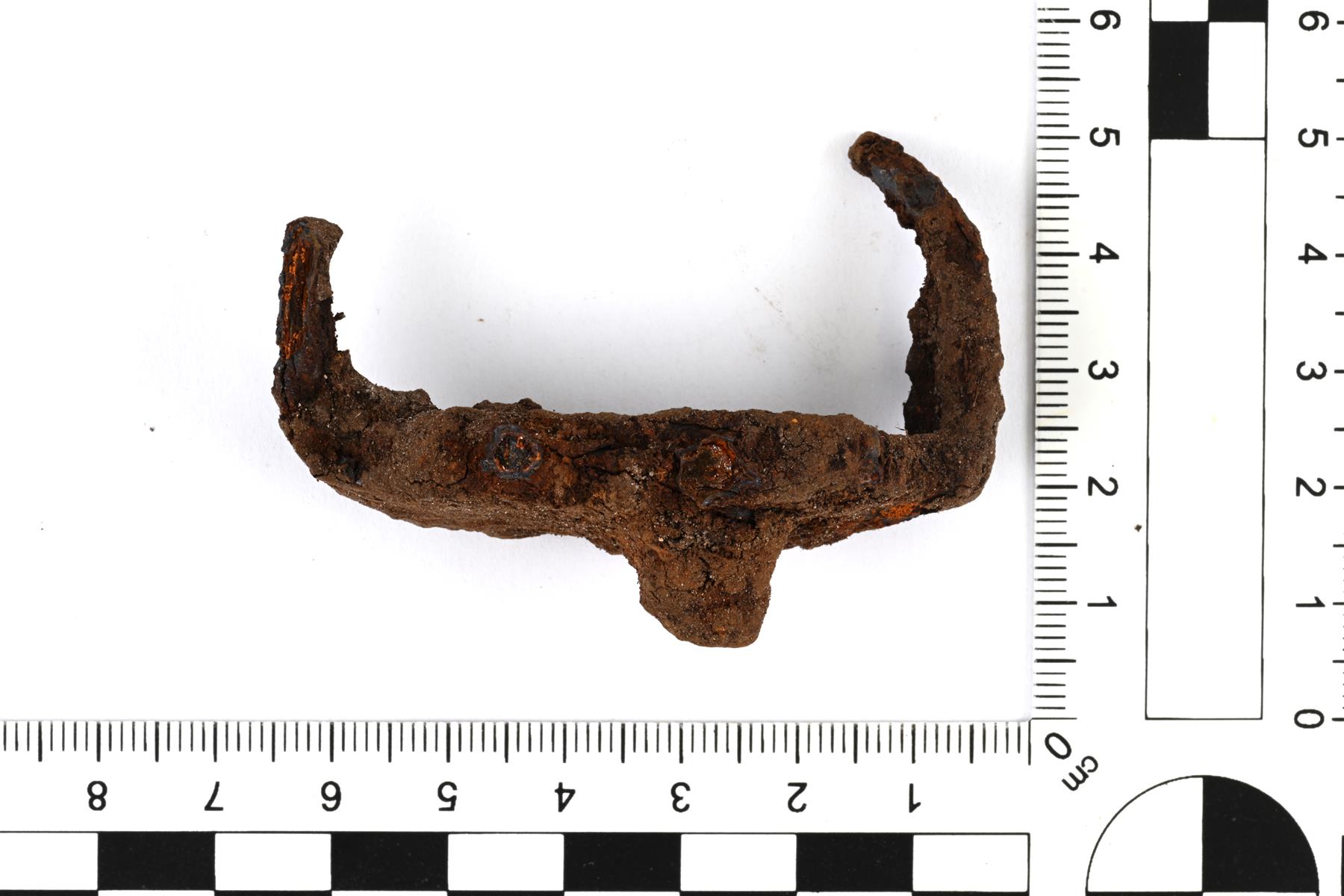 | Kaksipiikkinen viskari. Pohjalevy on muodoltaan ovaali. Piikeistä toinen on keskeltä katkennut ja toisesta puuttuu kärki. Pohjan nasta ei ole aivan keskellä. | |