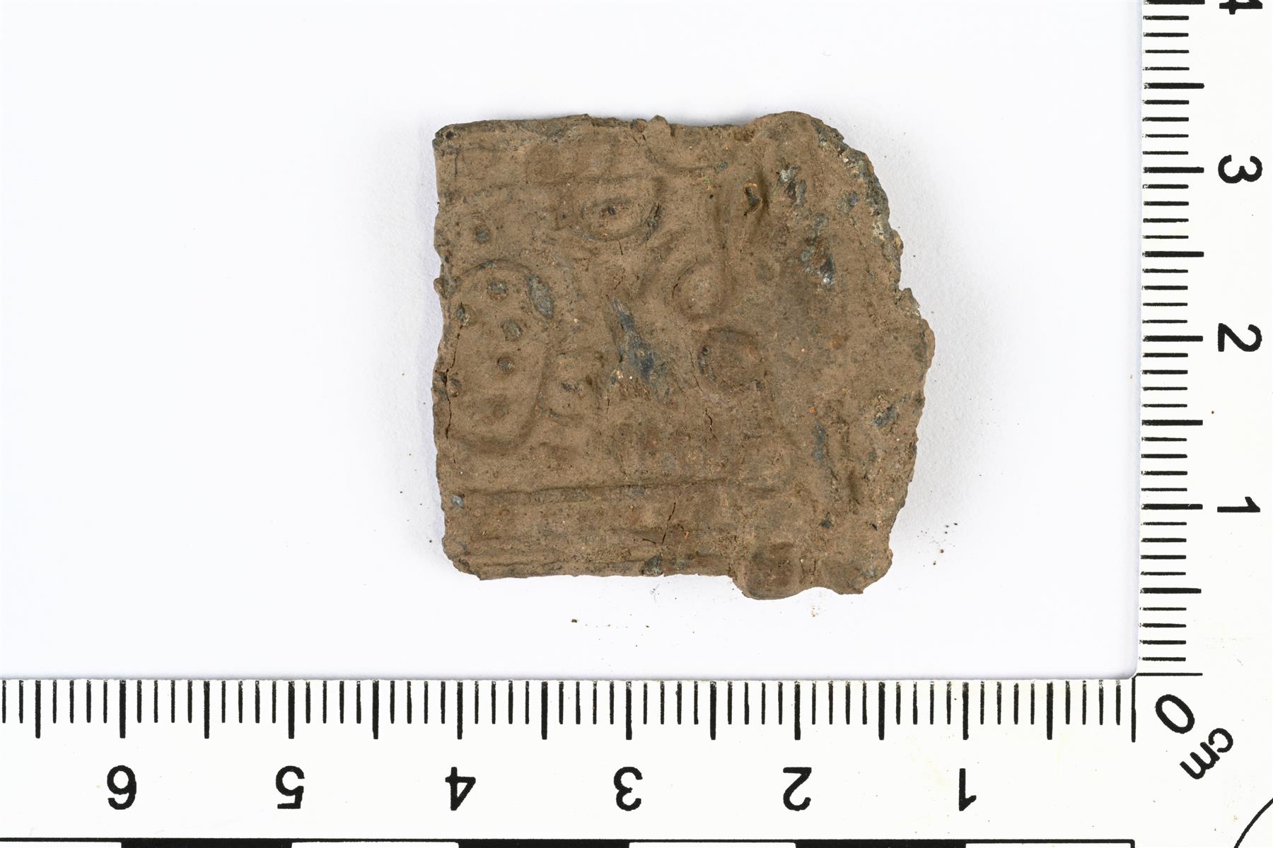 | Talonpoikaisen vyönhelan katkelma. Koristeltu kohokuvioisella viiva- ja pisteornamentiikalla. Taustapuolella on niitin jäänne. | |