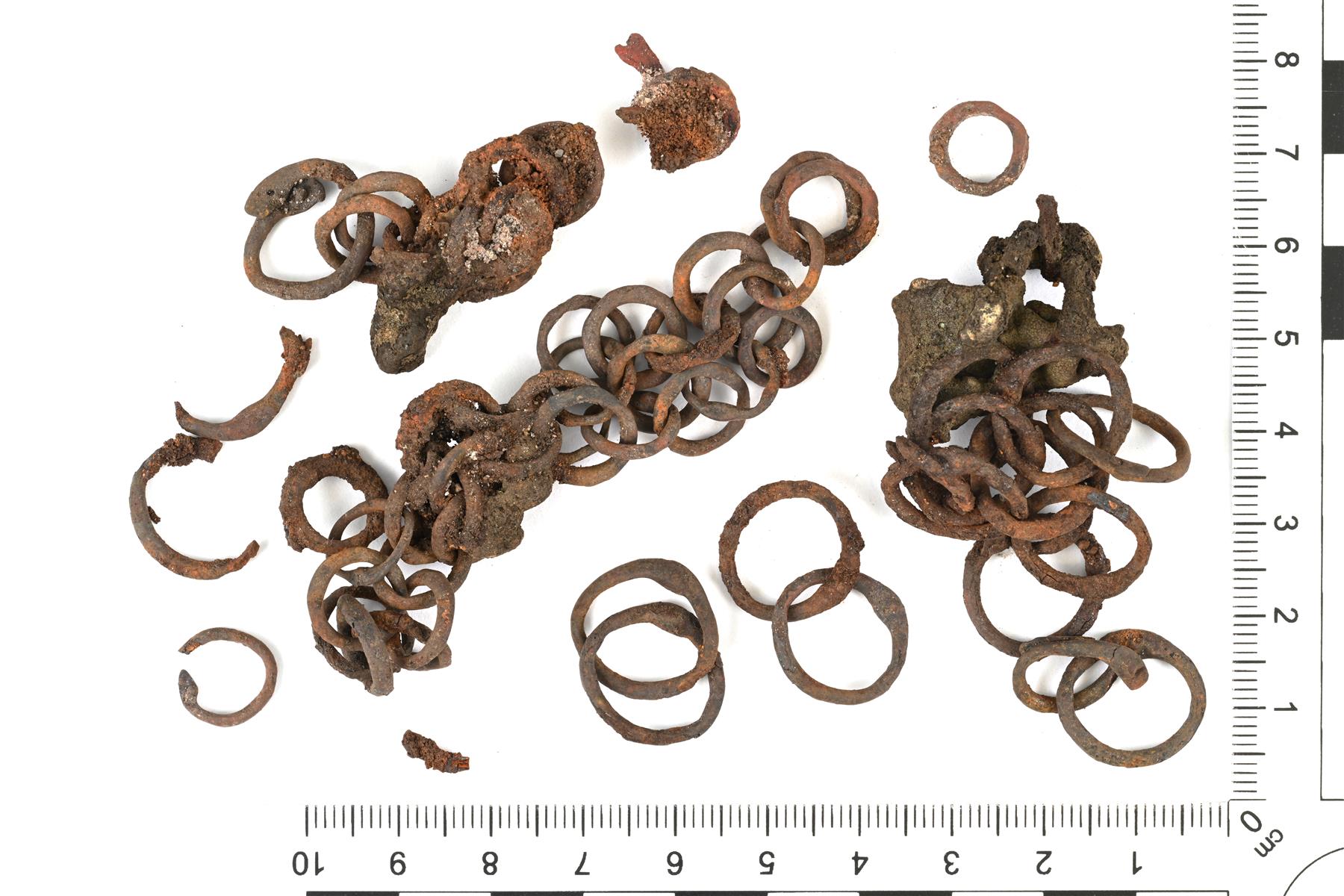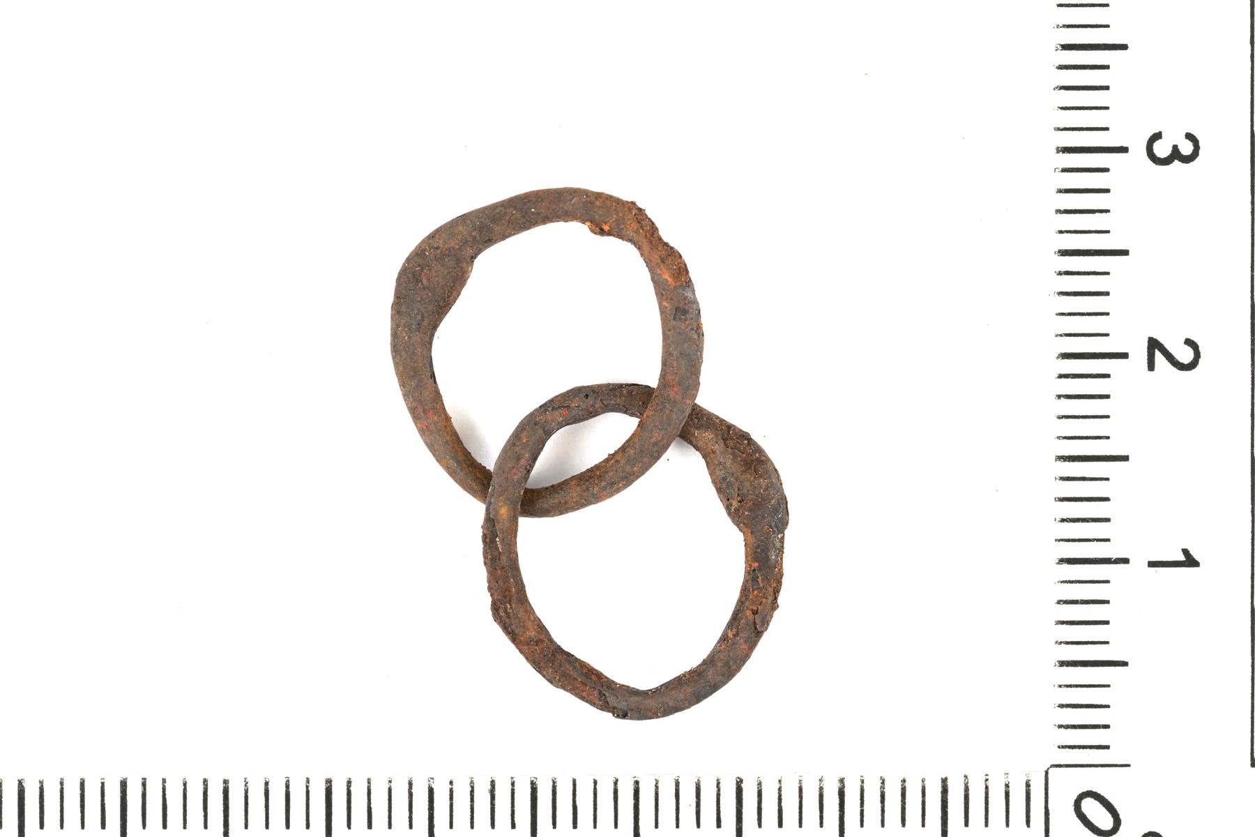 | Panssariketjun katkelmia ja irtonaisia lenkkejä. Osaan on tarttunut sulaneen kupariseoksen jäänteitä. Renkaiden halkaisija vaihtelee ja osa on muodoltaan ennemmin ovaaleja kuin pyöreitä. Renkaat ovat niitattu kiinni ja niittauskohta näkyy päiden paksunnoksena. Yhdessä renkaassa niittaus on auennut ja niitin reiän halkaisija on n. 0,6 mm. Lanka on poikkileikkaukseltaan pyöreä, mutta leveys vaihtelee joidenkin renkaiden kohdalla (kuluman aiheuttamaa?). Todennäköisesti leikattu rengaspanssarista. Vastaavia tunnetaan Karjalan ristiretkiajalta. Ks. Kivikoski Abb. 1107. | |