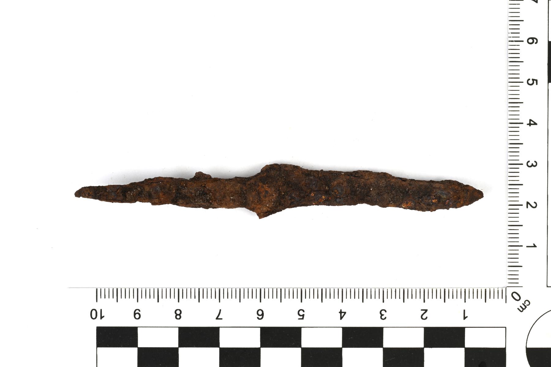 | Suorahamarainen ja piiloruotoinen veitsi. Terä on poikkileikkaukseltaan kolmiomainen. Teränsuu on erittäin kulunut. Ruodon ja terän liitoskohdassa on molemmilla puolilla olat. | |