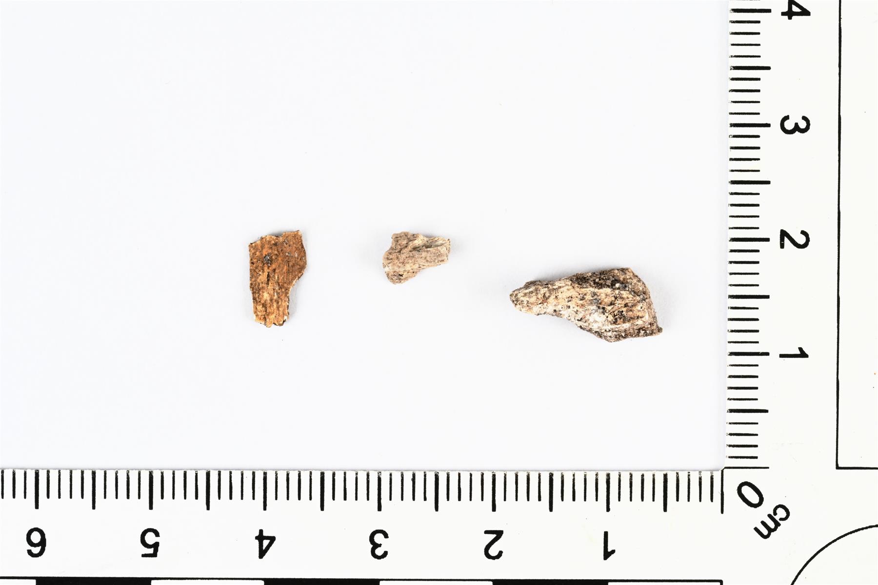 | Palaneen luun siruja. Suurin on varmuudella putkiluusta. Yksi on väritykseltään ruskehtavan keltainen ja kaksi muuta harmaanvalkoisia. Palaneet melko korkeassa lämpötilassa. | |