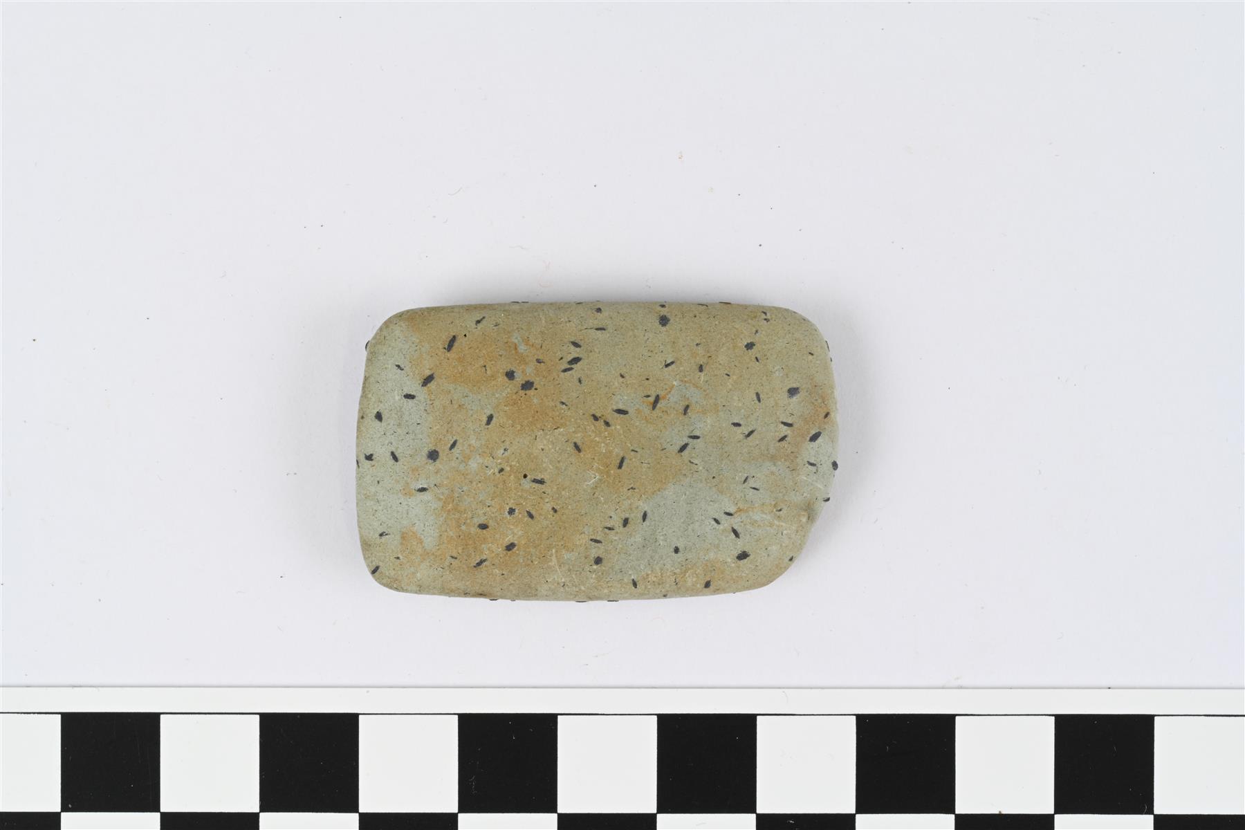 | Pieni tasataltta. Vihreänharmaata mustarakeista kiveä. Pinta vedessä erodoitunut. Selkälappeelta lohjennut kappale. Lappeet ja sivut suorat. | |