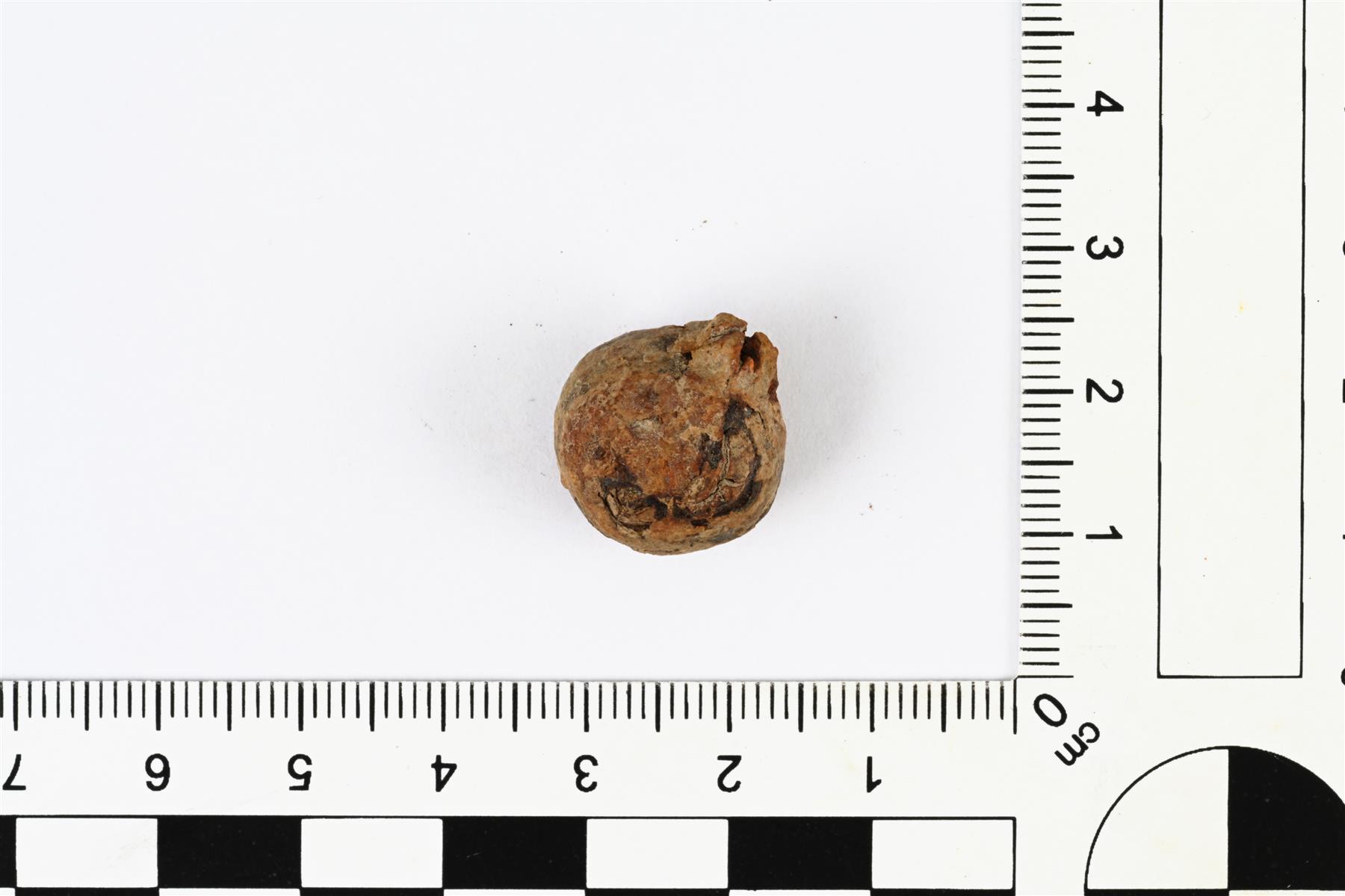 | Kuulamainen punnus. Navat on viistetty tasaisiksi. Pinnassa on korroosiota. Ehjänä säilyneellä navalla ei näy koristelua. Navan halkaisija: 7,5 mm. | |