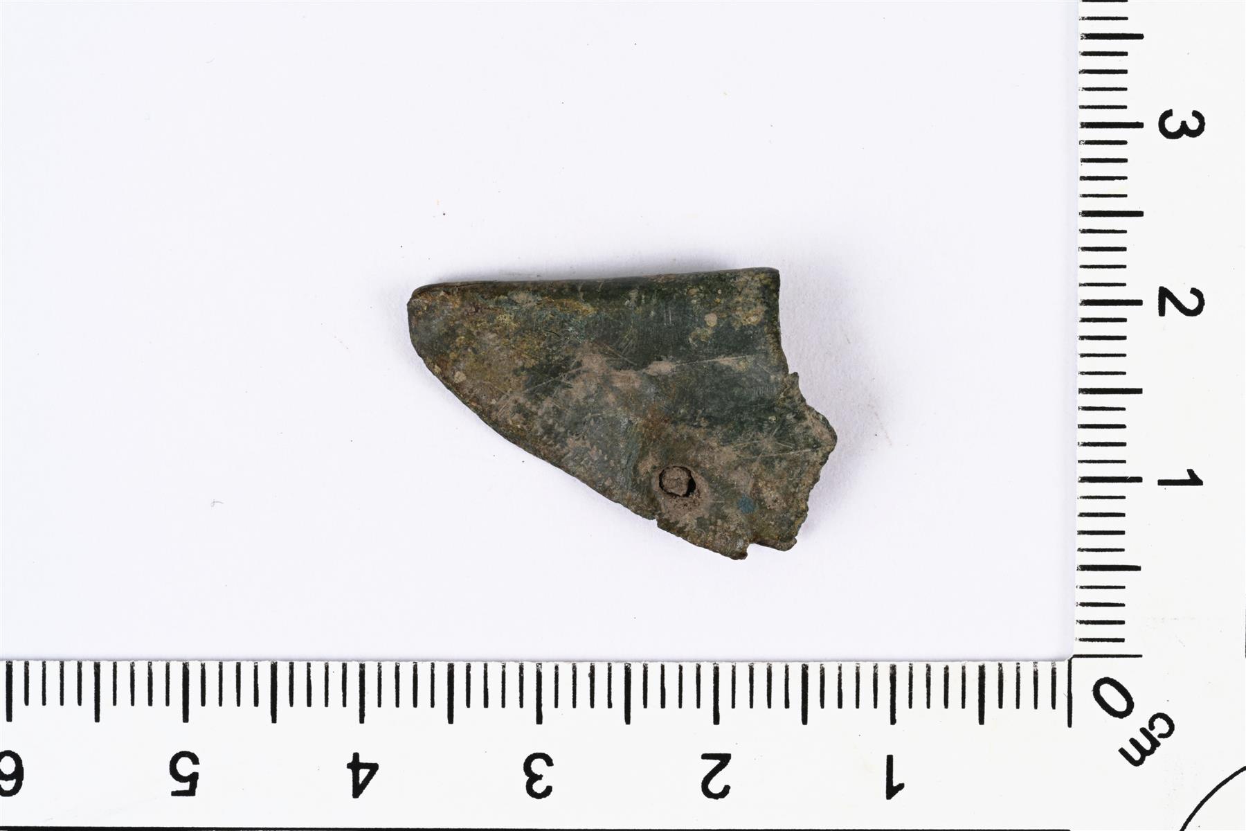 | Veitsen tupen helan katkelma. Tupen kärjestä. Tehty taittamalla kupariseospelti kaksinkerroin. Reunassa on niittausreikä. Koristeluna kaksi sahalaitakuvioista viivaa. | |
