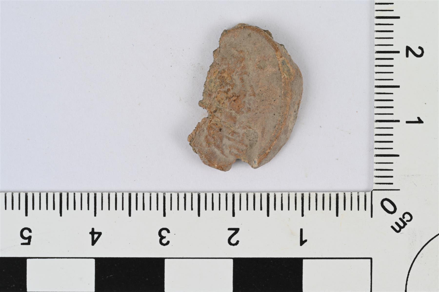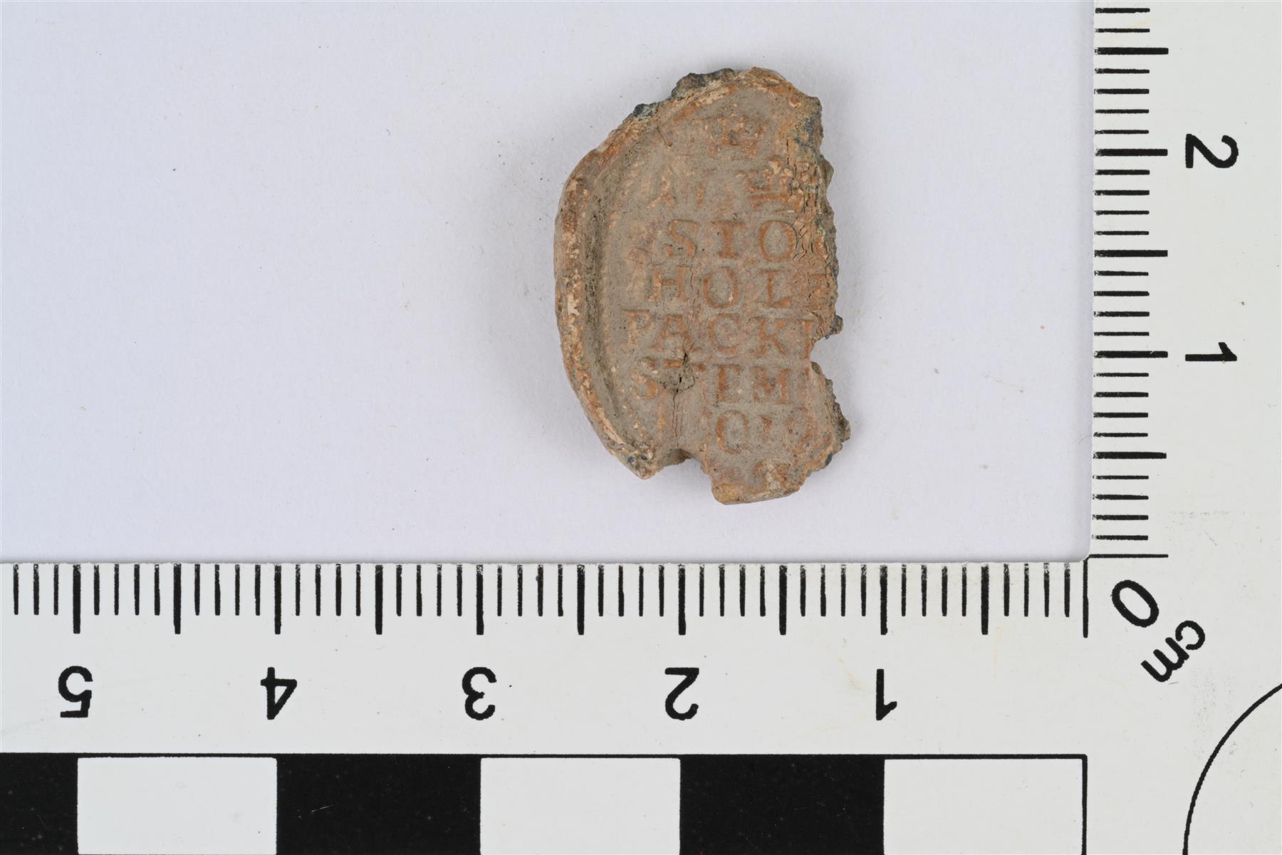| Lyijysinetin, plombin puolikas. Litteähkö, alareunassa pieni reikä. Toisella puolella tekstiä ja muita kuvioita, haljennut pystysuunnassa kahtia niin, että tekstistä on jäljellä vain kunkin rivin alku. Ylimpänä kolme kruunua ja niiden vieressä vuosiluvun alku 17, niiden alla kukin omalla rivillään tekstin pätkät STO HOL PACK STEM (Stockholm packhus stempel). Toisella puolella kuninkaan profiilissa kuvattu rintakuva. | |