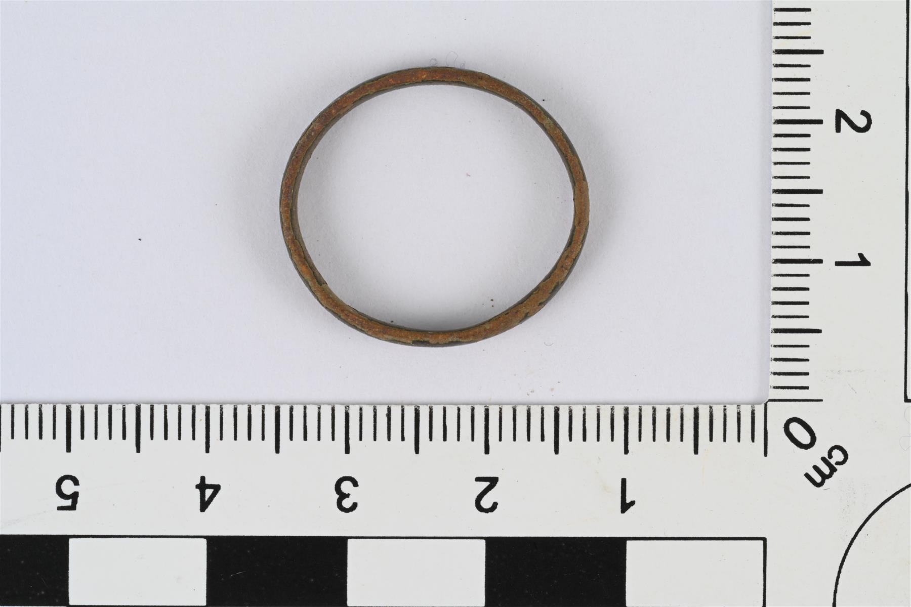 | Yksinkertainen tasalevyinen sileä kupariseossormus. Litistynyt hieman soikeaksi, halkaisija 20-22 mm. | |