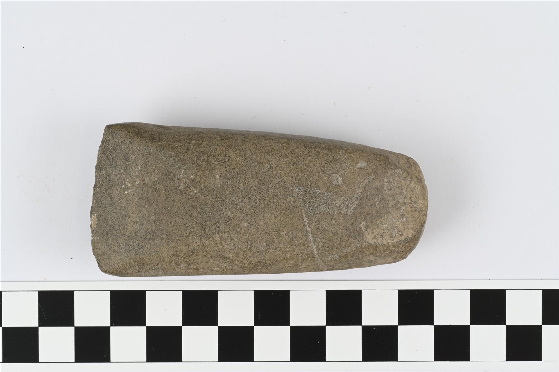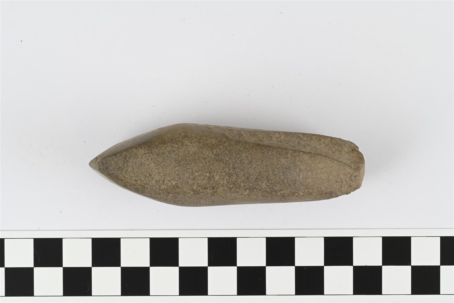 | Pieni nelisivuinen oikokirves, tummanharmaata kiveä. Suorat sivut, kuperat lappeet. Molemmilta lappeilta lohkeillut paloja. | |