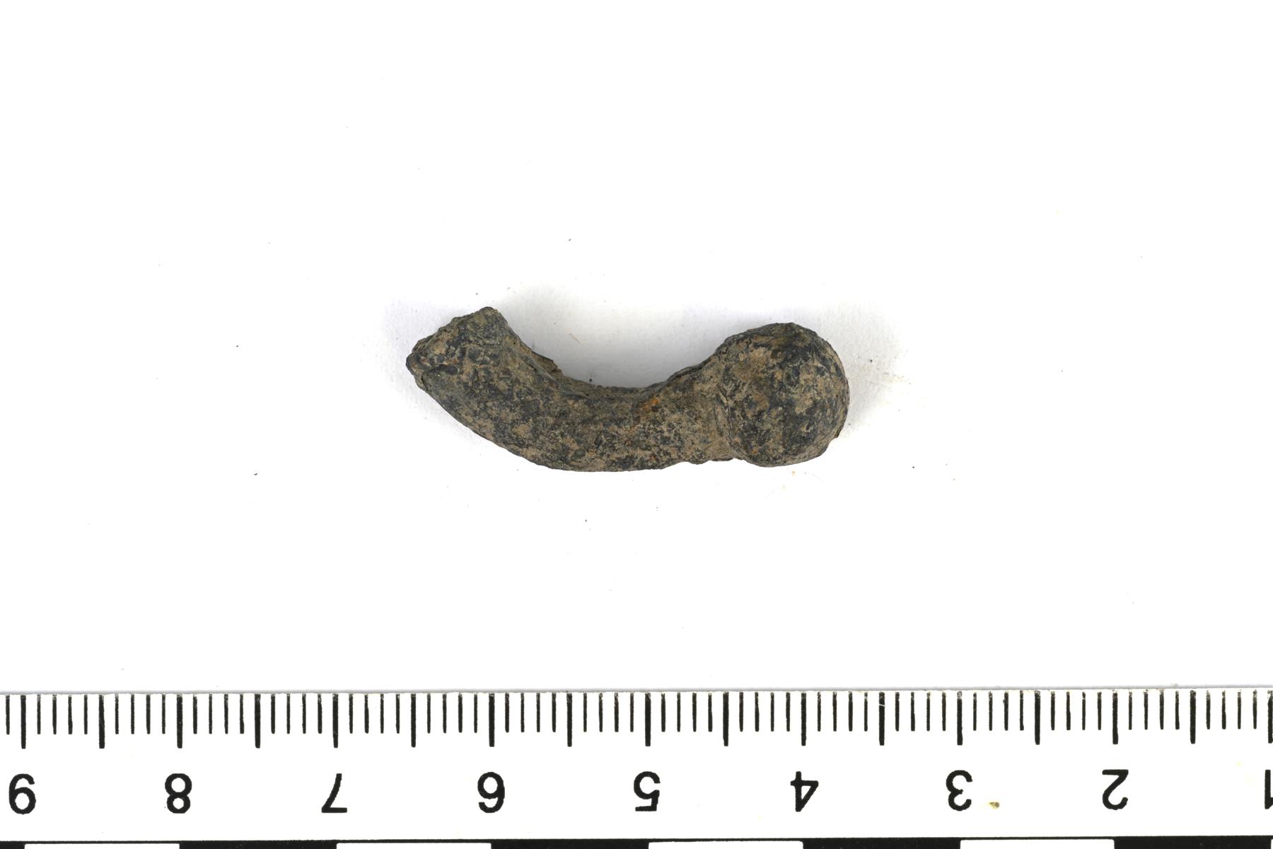 | Karkeatekoiseen nuppiin päättyvän rannerenkaan katkelma. Murtumapinta näyttää osin sulaneelta. Vrt. Kivikoski Abb. 29. | |