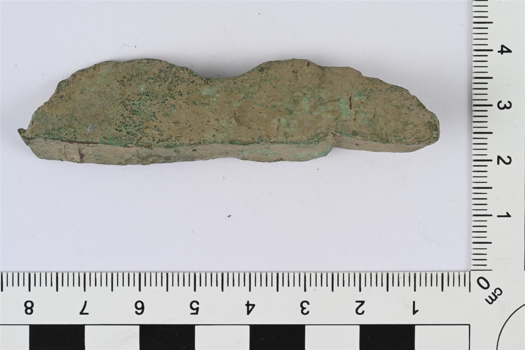 | Kupariseosesineen katkelma. Pitkittäinen katkelma kulmikkaasta esineestä, jossa kulmaa ja kahta sivua. | |