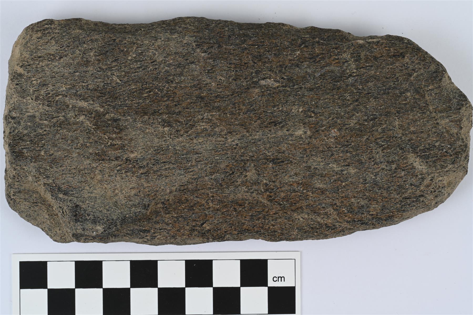 | Litteä pitkänomainen liuskekiven pala. Toinen pää mahdollisesti hieman pyöristetty. Mahdollisesti raaka-ainepala. | |