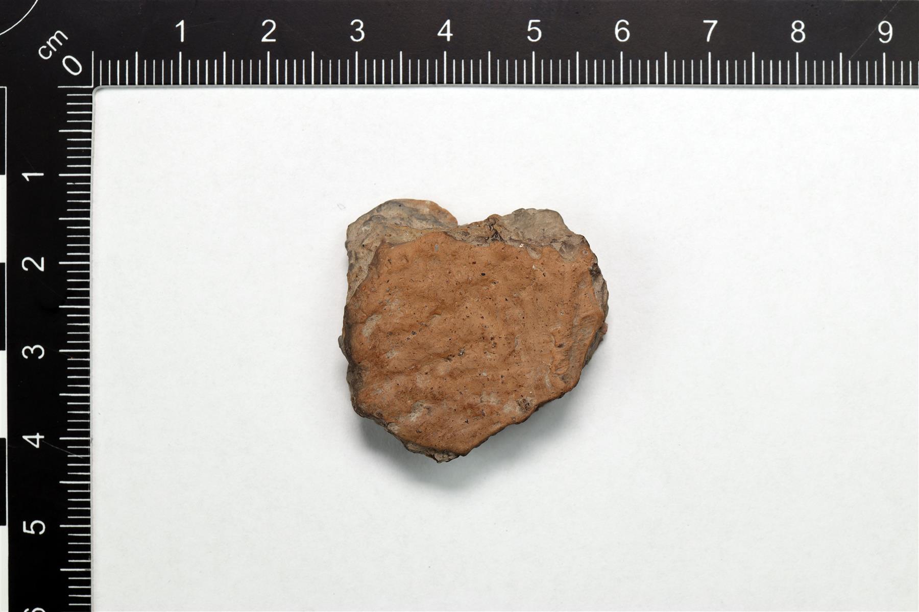 | Saviastian pala, jonka ulkopinnalla on tekstiilipainanne. Sisäpinta on naarmutettu. Saviaines on tiivis ja kivimurskasekoitteinen. Palan pinnoissa savimassa on ruskea ja ytimessä harmaanruskea. | |