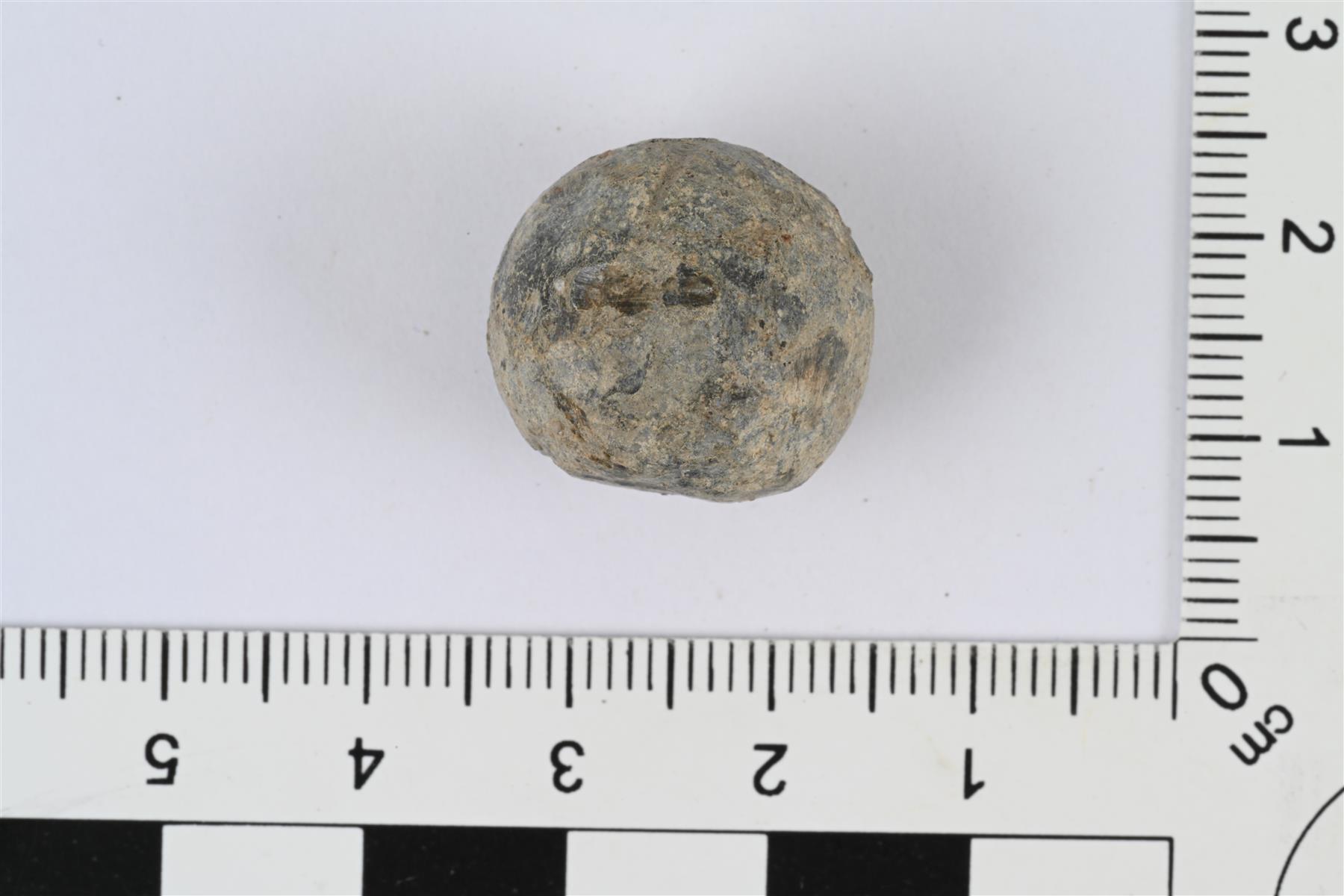 | Pyöreähkö lyijykuula, luultavasti musketinkuula. | |