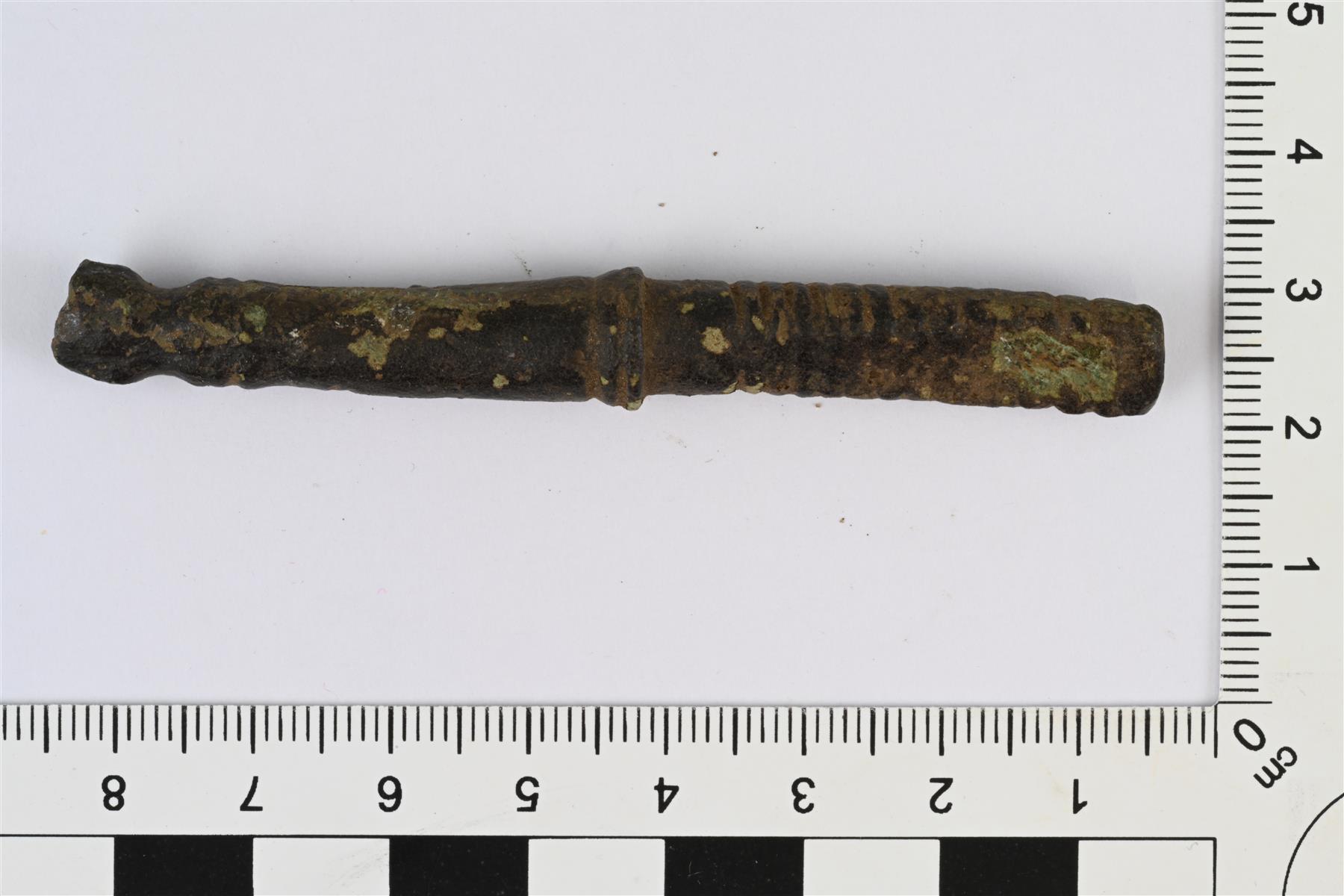 | Kupariseospuikko. Keskellä paksunnos, jossa kaksi kohovyötä, poikkileikkaus pyöreä. Toinen pää keskikohdasta lähtien litistyvä, pää kulmikas, pinnassa poikkiviivoitusta. Toinen pää hieman oheneva, poikkileikkaukseltaan aluksi pyöreä, pää profiloitu kapenevaksi ja taas leveneväksi, pään levennys litistyvä ja katkennut. | |