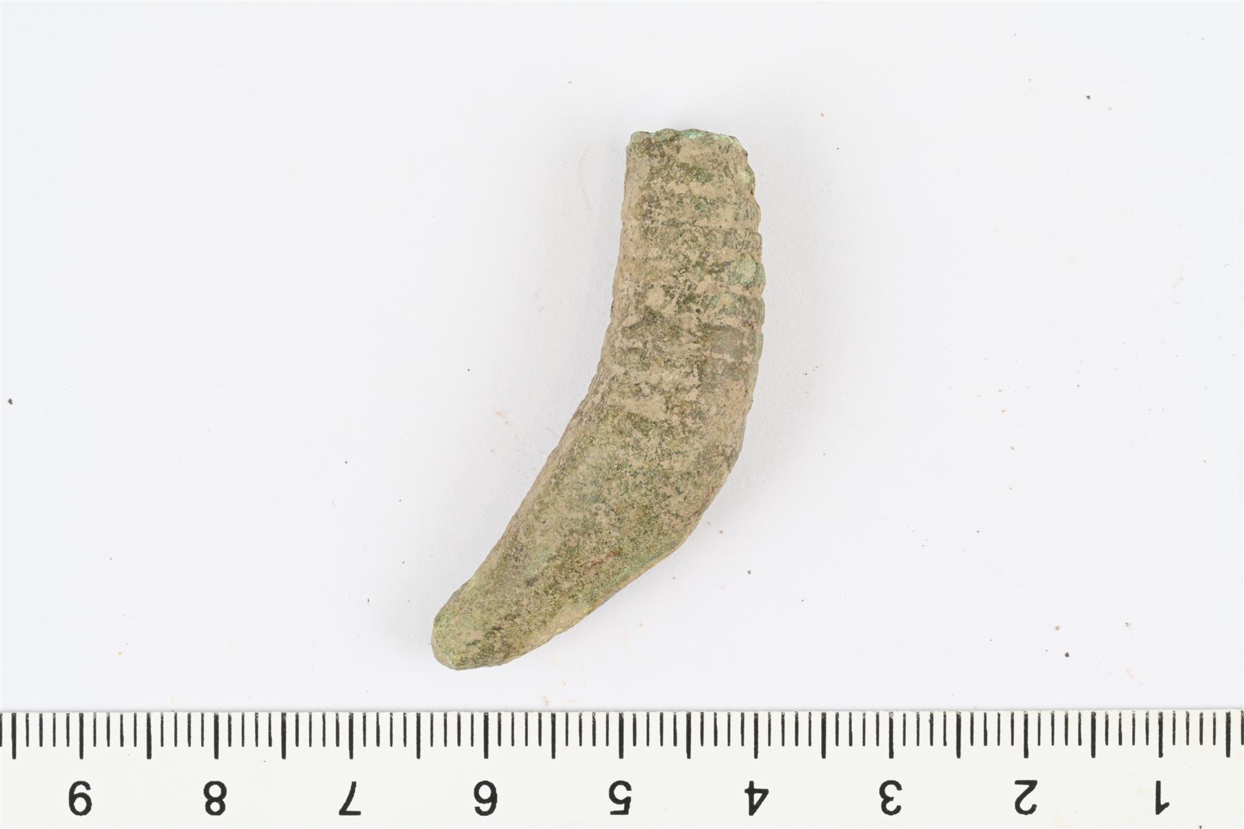 | Katkelma jykevästä karhunhammasriipuksesta. Yläosa lenkkeineen puuttuu. | |