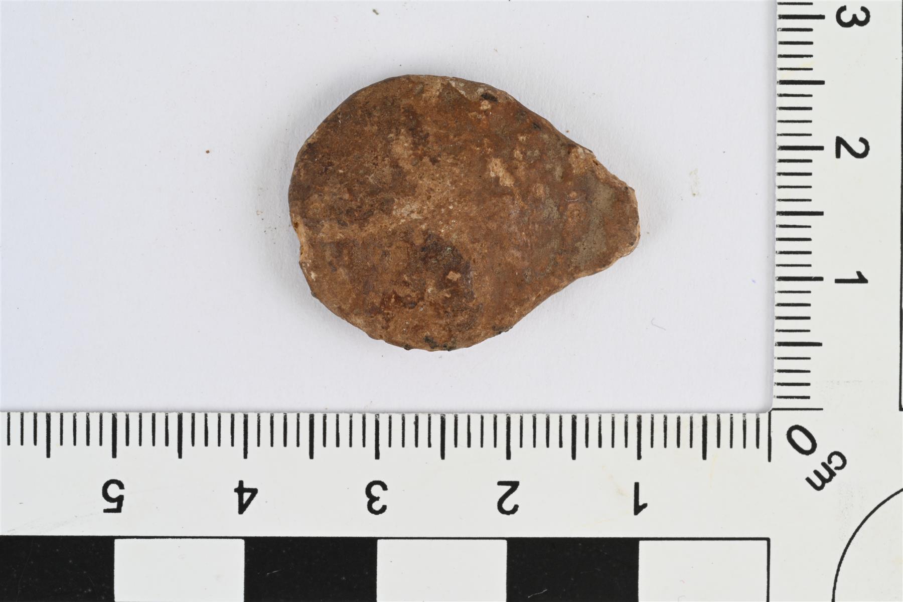 | Pisaranmuotoinen litteähkö lyijyesine, luultavasti deformoitunut musketinkuula. | |