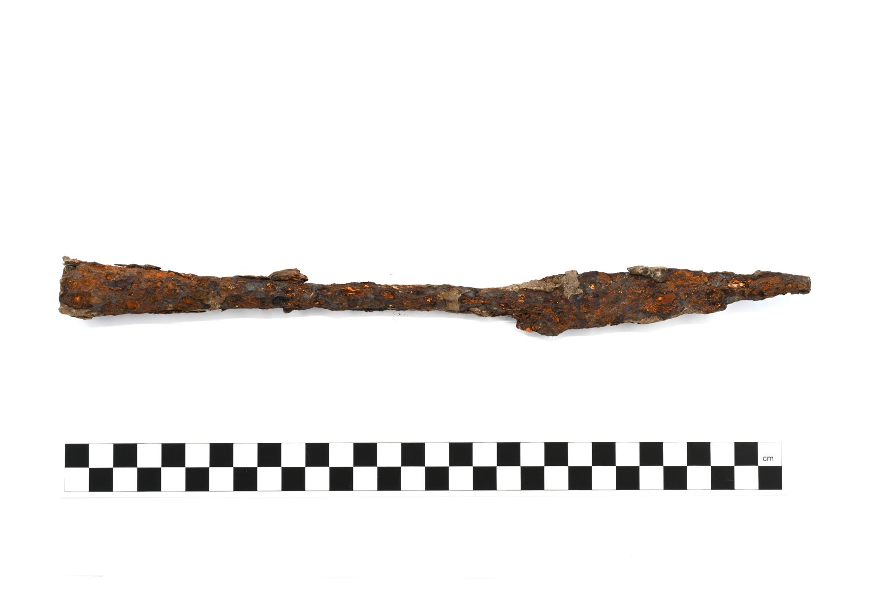| Väkäsellinen putkikeihäänkärki. Putki on melko pitkä (200 mm). Lehden tyvessä on säilyneenä toisen väkäsen jäänne. Pinnan korroosiokerros on pääosin kuoriutunut pois. Vrt. Kivikoski Abb. 302 ja 304. | |