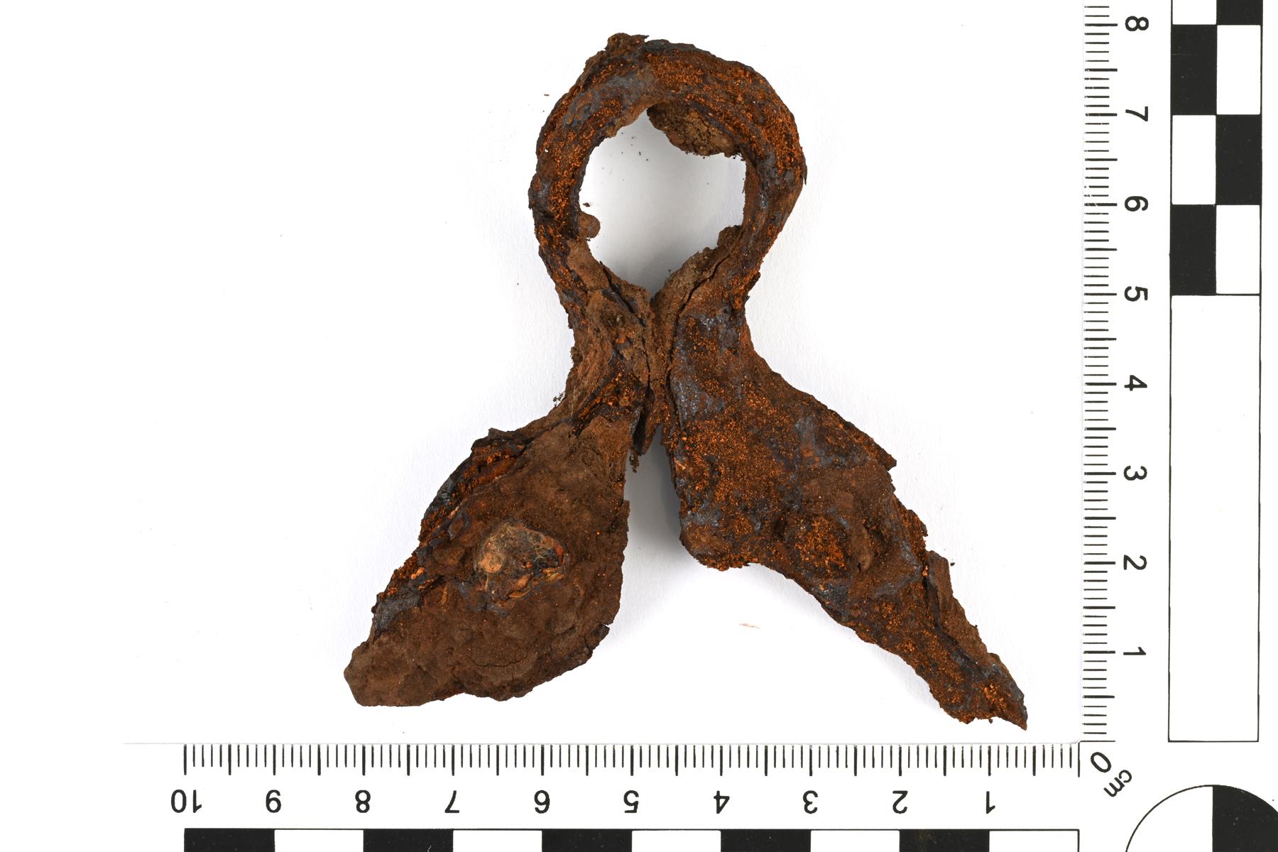 | Rautainen padan korvake. Päät ovat lehdenmuotoiset. Huonokuntoinen. Samanlainen kuin : 3. | |
