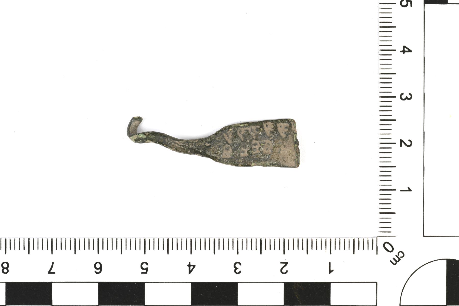 | Hevosenkenkäsoljen neulan tyviosan katkelma. Soljen kehän ympärille kierretyn levymäisen osan koristeluna on kolmioleimoja. Leimakuvioiden sisällä on kolme kohopistettä. | |