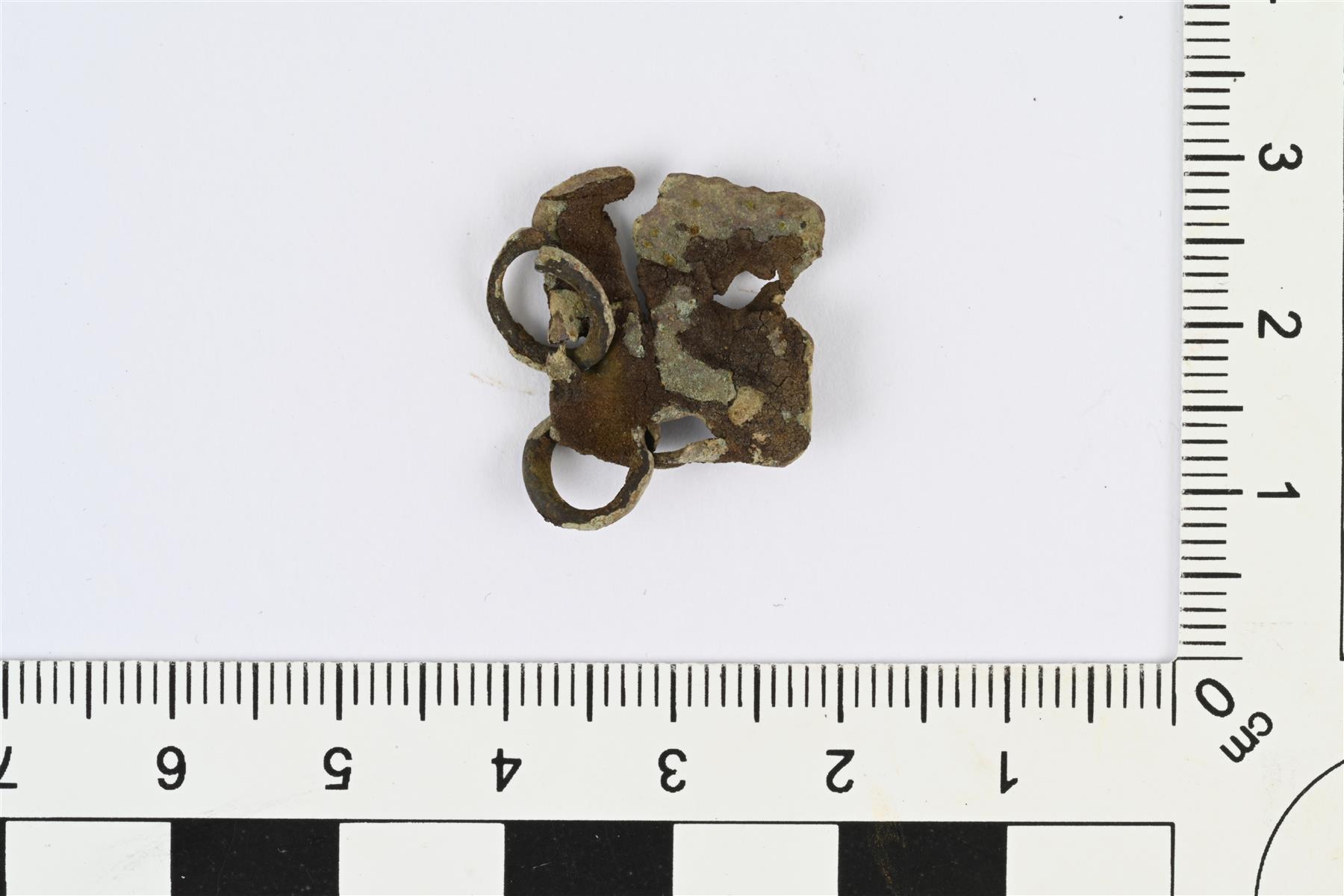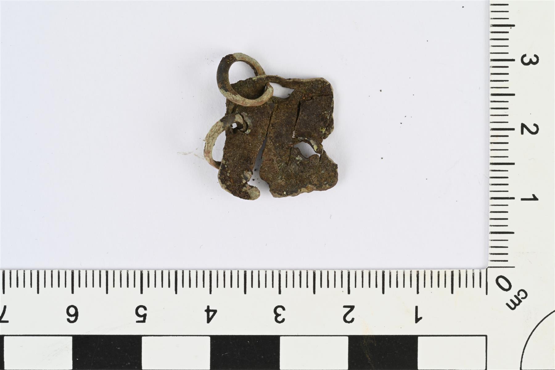 | Kupariseosesine, mahdollisesti jonkinlainen riipuskoriste. Nelikulmainen kupariseospellin pala, johon on tehty ainakin kolme, mahdollisesti neljä reikää. Reiät ovat neliön sivujen keskellä tai hieman keskikohdasta sivussa, yhden mahdollisen reiän kohdalta levy rikkoutunut. Kahdessa reiässä kiinni avonaiset kupariseosrenkaat, joiden halkaisija noin 8 mm. Paksuus mitattu renkaan kohdalta, levyn paksuus 0,5-1 mm. Samantapaisia rei’itettyjä kupariseospellin katkelmia Pohjois-Ruotsin uhrilöydöissä: Serning 1956, s. 93. | |