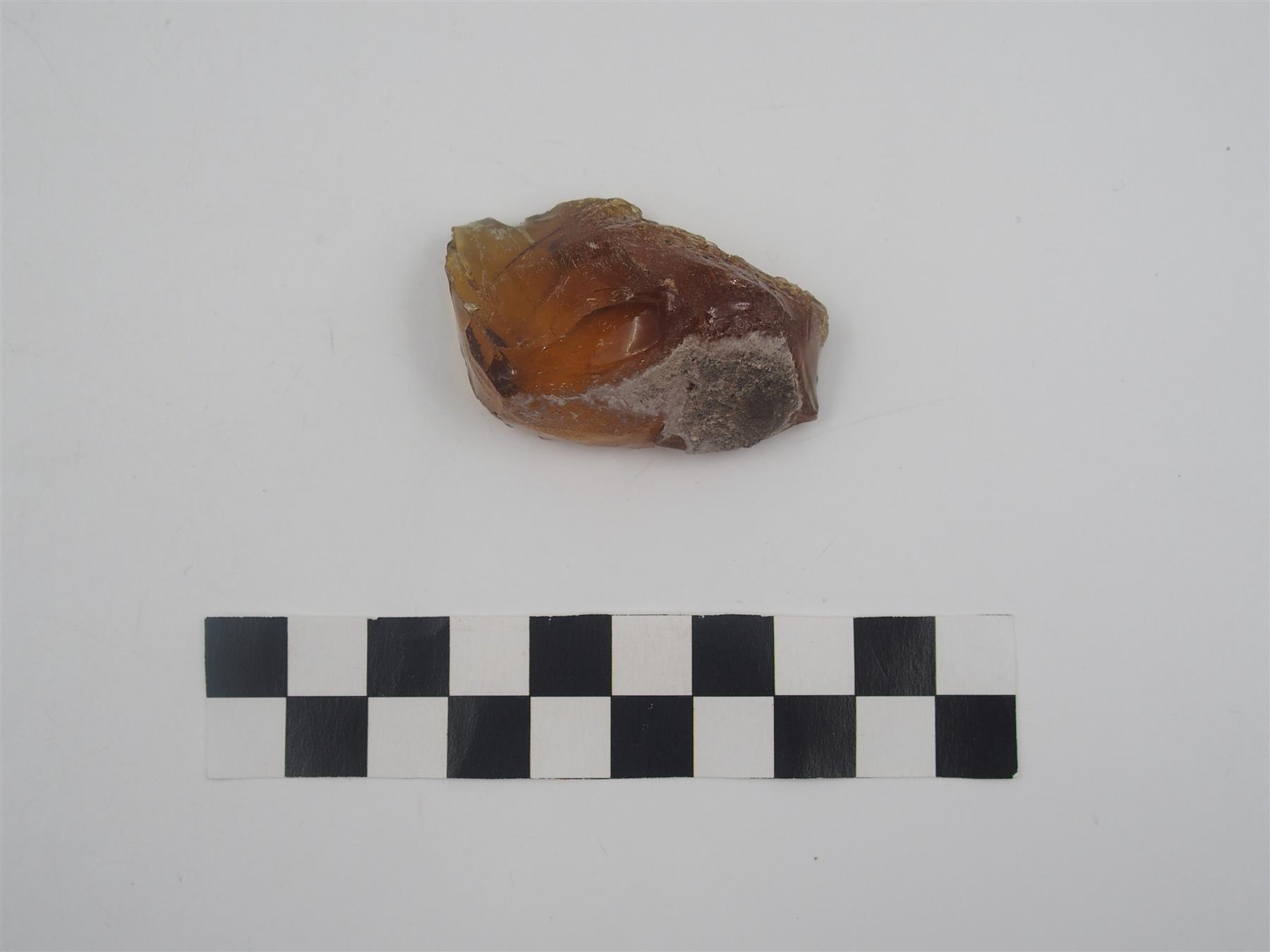 | Ruskea lasimassapala. Palan pinnat lohkeillut ja niistä irronnut iskoksia. Yhdeltä sivulta kappale on kuplinut kuumuudesta johtuen. Palassa kiinni myös vaaleaa keraamiselta vaikuttavaa ainetta kiinnittyneenä. Mahdollisesti upokkaasta tai puhallusmuotista. | |