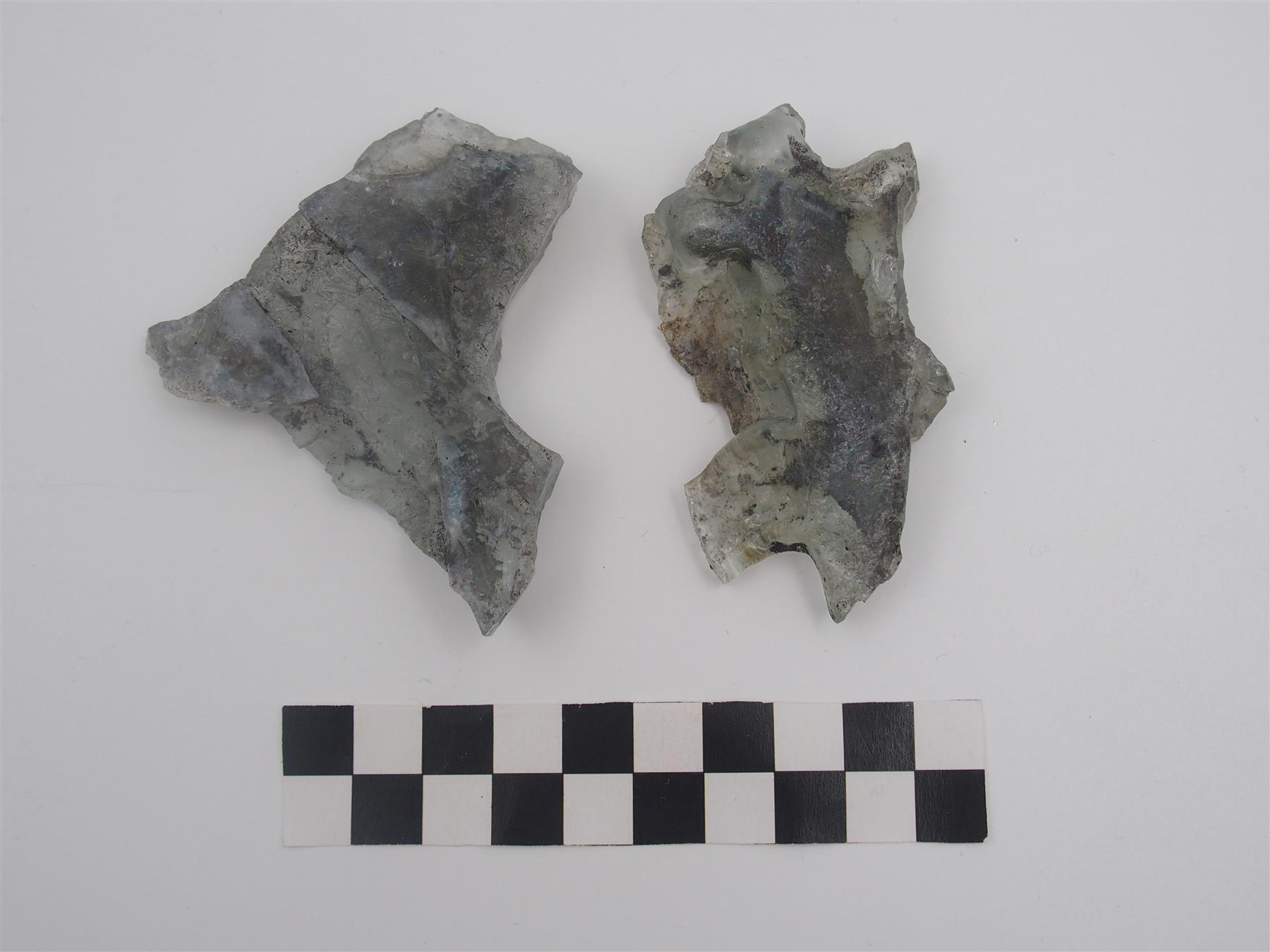 | Kaksi kirkasta sulaneen lasimassan palasta. | |