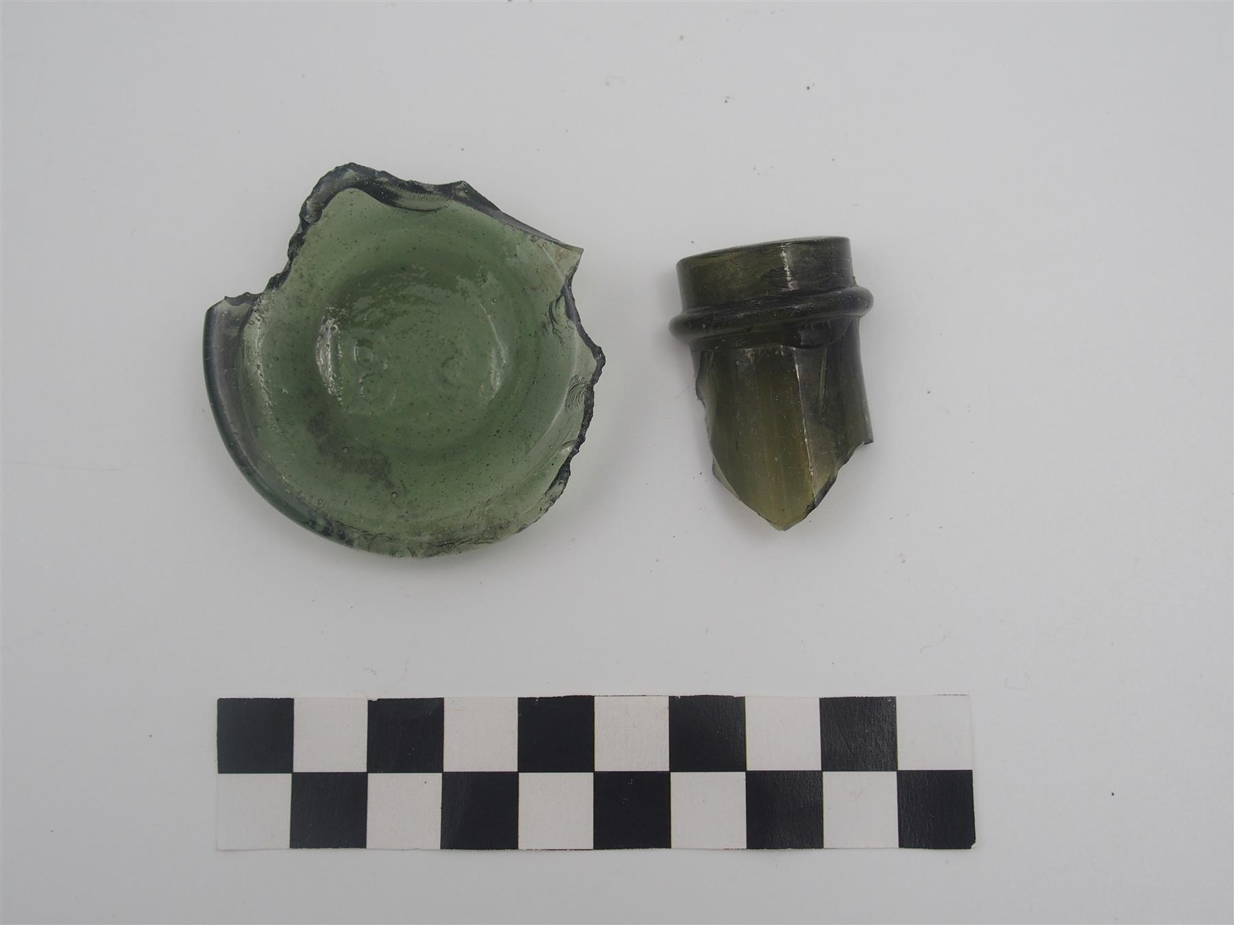 | Tummanvihreästä lasista tehtyjen pullojen pohja sekä puolikas kaulaosa. Pullonpohjassa leima "B" sekä mahdollisesti "c". | |