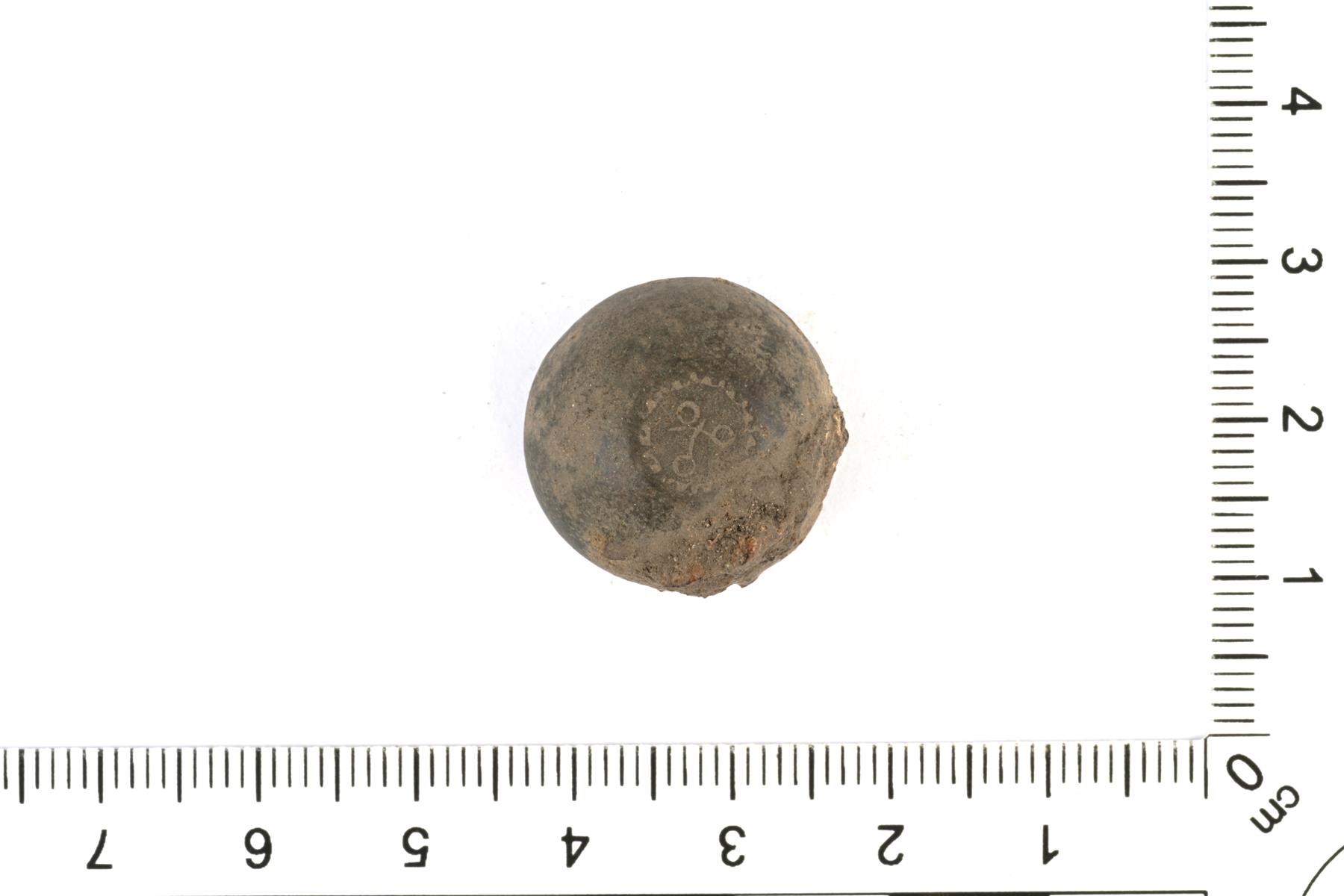 | Kuulamainen punnus. Navat on viistetty. Navoilla on koristeena häränsilmäleimoja ja reunaa kiertää helmiviiva. Pinnassa on korroosiota. Napojen halkaisijat: 8,3 ja 8,4 mm. | |