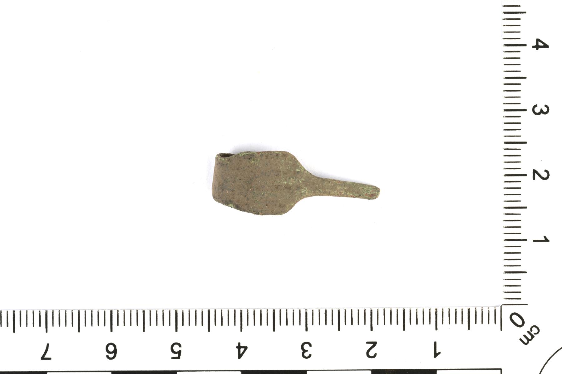 | Hevosenkenkäsoljen neulan katkelma. Tyviosa on levymäinen ja koristeltu viivauurteilla. | |
