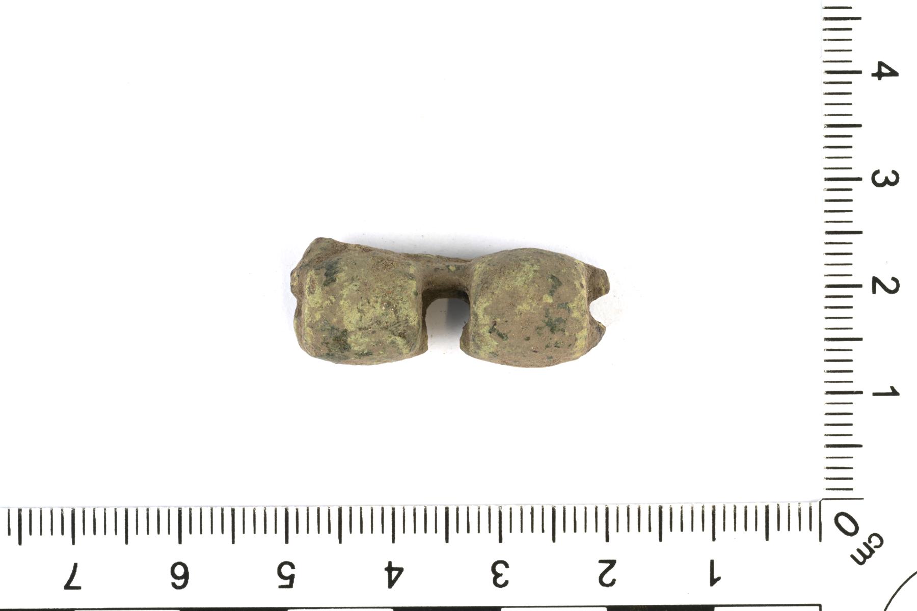 | Kaksi valukanavalla yhteenliitettyä kupariseoshelmeä. Helmien reunoja kiertää valinsauma. Helmet ovat muodoltaan tynnyrimäiset. | |