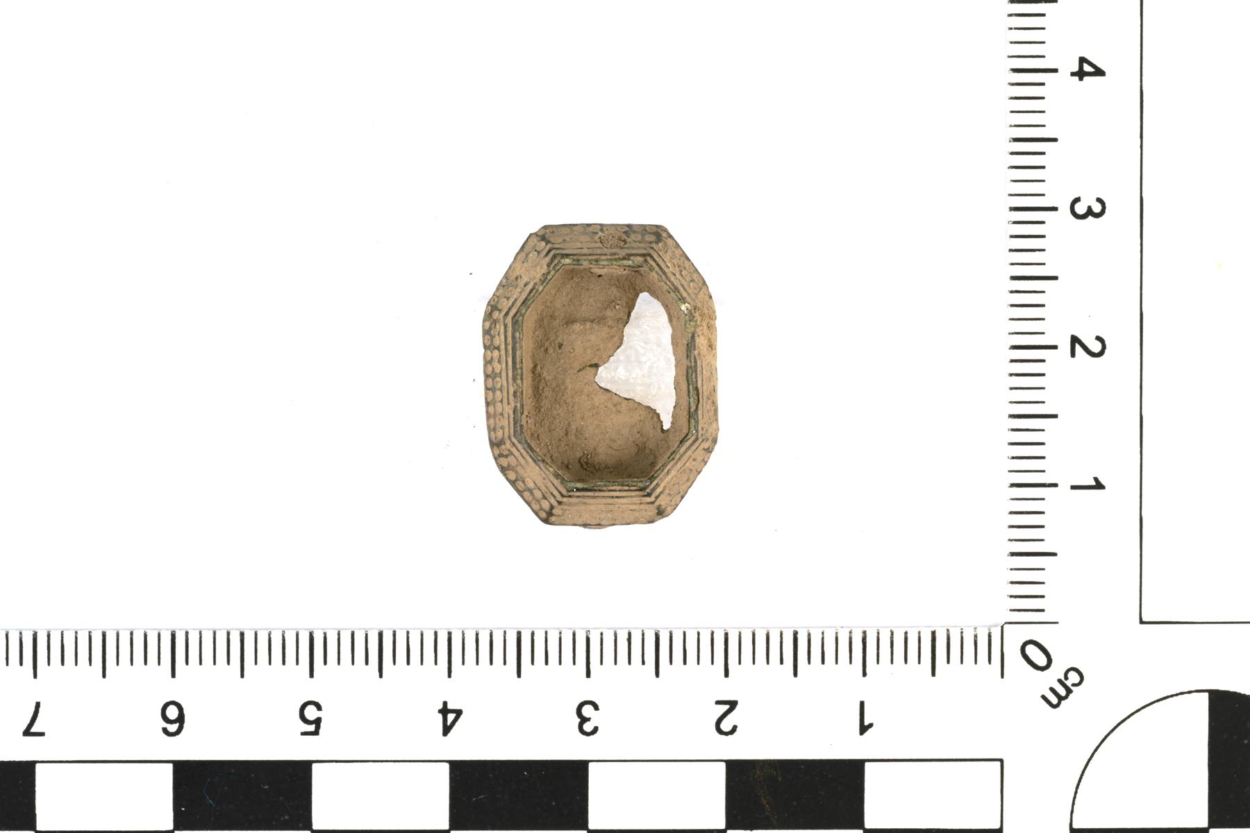 | Kantasormuksen kannan katkelma. Keskelle istutettu kivi tai lasi puuttuu. Muodoltaan kahdeksankulmainen. Kannan reunoja kiertää pisterivit. | |