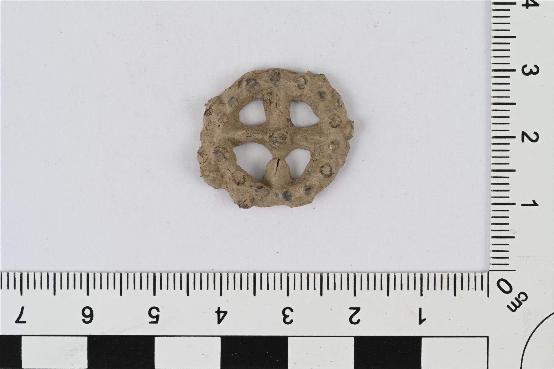 | Ympyräristin muotoinen litteä esine, tina- tai lyijyseosta. Luultavasti katkelma ns. maljusta eli naisten liivin nyörityksessä käytetystä hakasesta. Reunassa murtumakohta, josta luultavasti lohjennut lenkki. Ympyrän kehällä kohopalloja, joita yksi myös ristin keskellä. Talonpoikaisvalua, reunoissa ylimääräistä ainesta ja yksi ristivarsista on keskeltä lähes poikki. Vrt. Sirelius 1990, s.127, kuva 139. | |