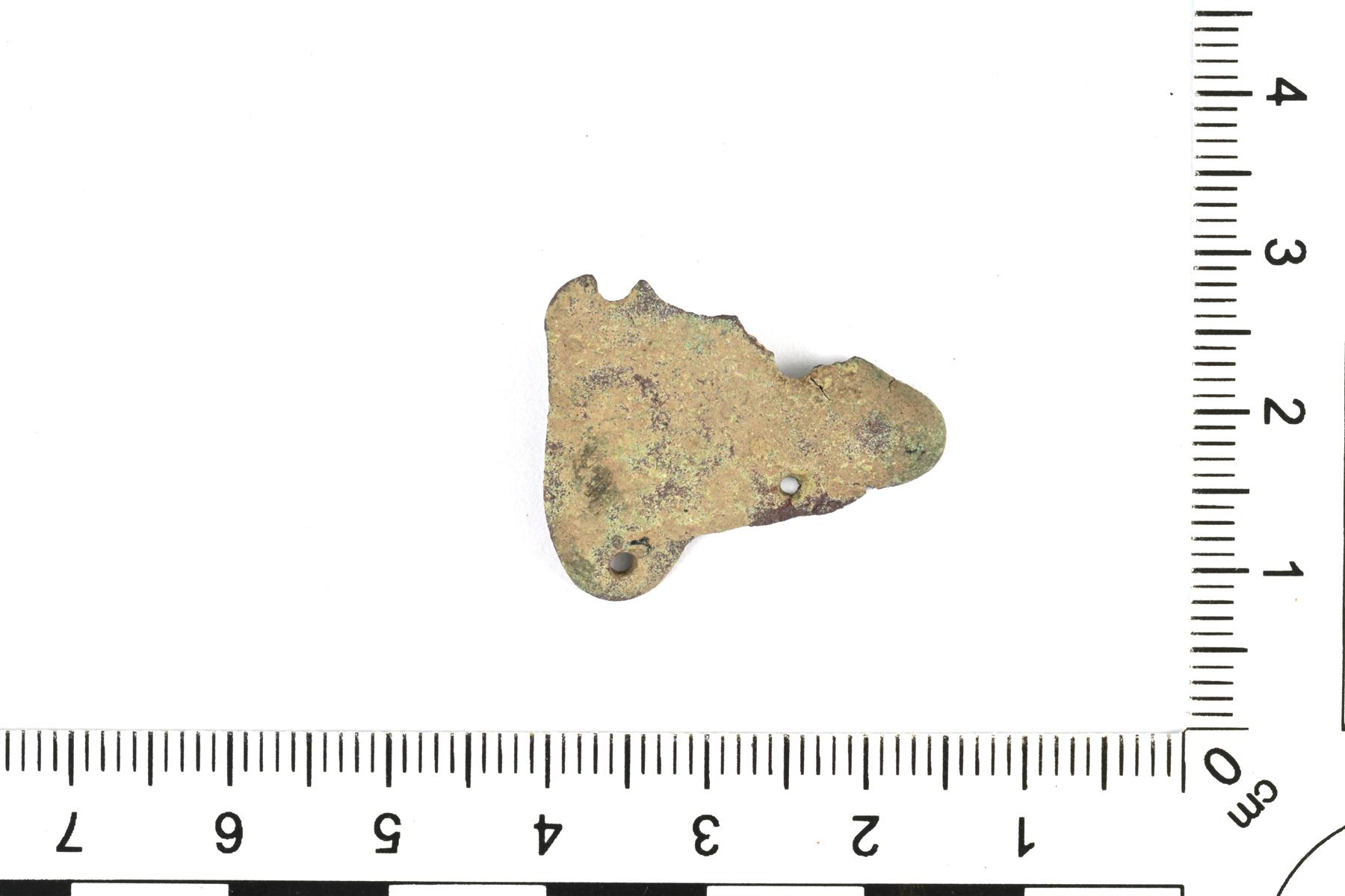 | Lähes tunnistamattomaksi kulunut tasavartisen soljen päätykatkelma. Taustapuolella on säilynyt jäänne neulakodasta. | |