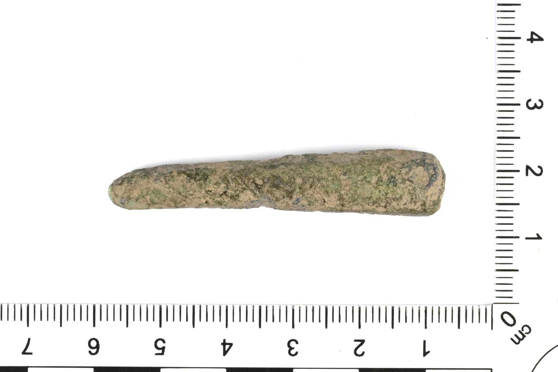 | Päähän kapeneva kupariseosvarras. Poikkileikkaukseltaan D:n muotoinen todennäköisesti rannerenkaan katkelma. | |