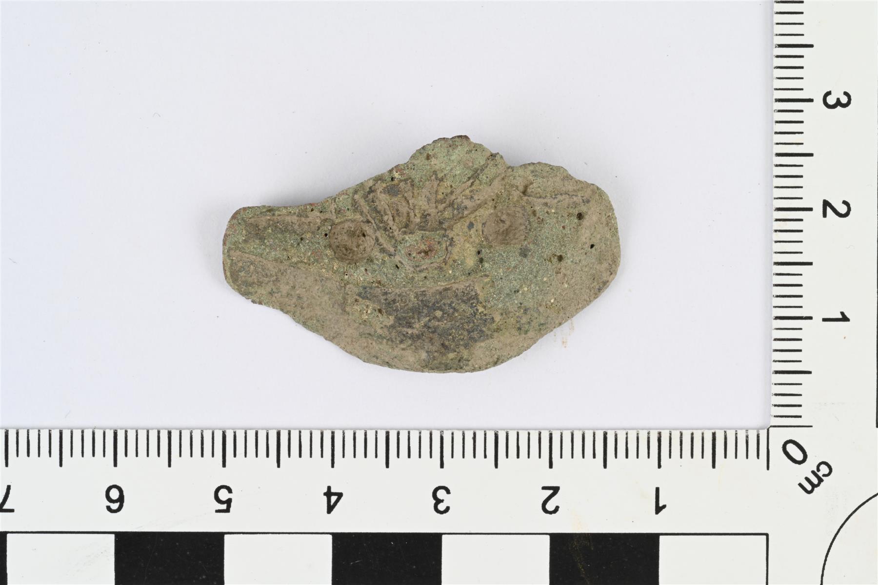 | Pyöreän kupurasoljen reunakatkelma. Vastaa Appelgrenin D-tyyppiä. Leveä reunus. Etupuolella matala tappi ja kaksi kuoppaa, ei läpireikiä. Taustapuolella neulakota. Paksuus mitattu neulakodan ja tapin kohdalta, kuoren paksuus 1,5 mm. | |