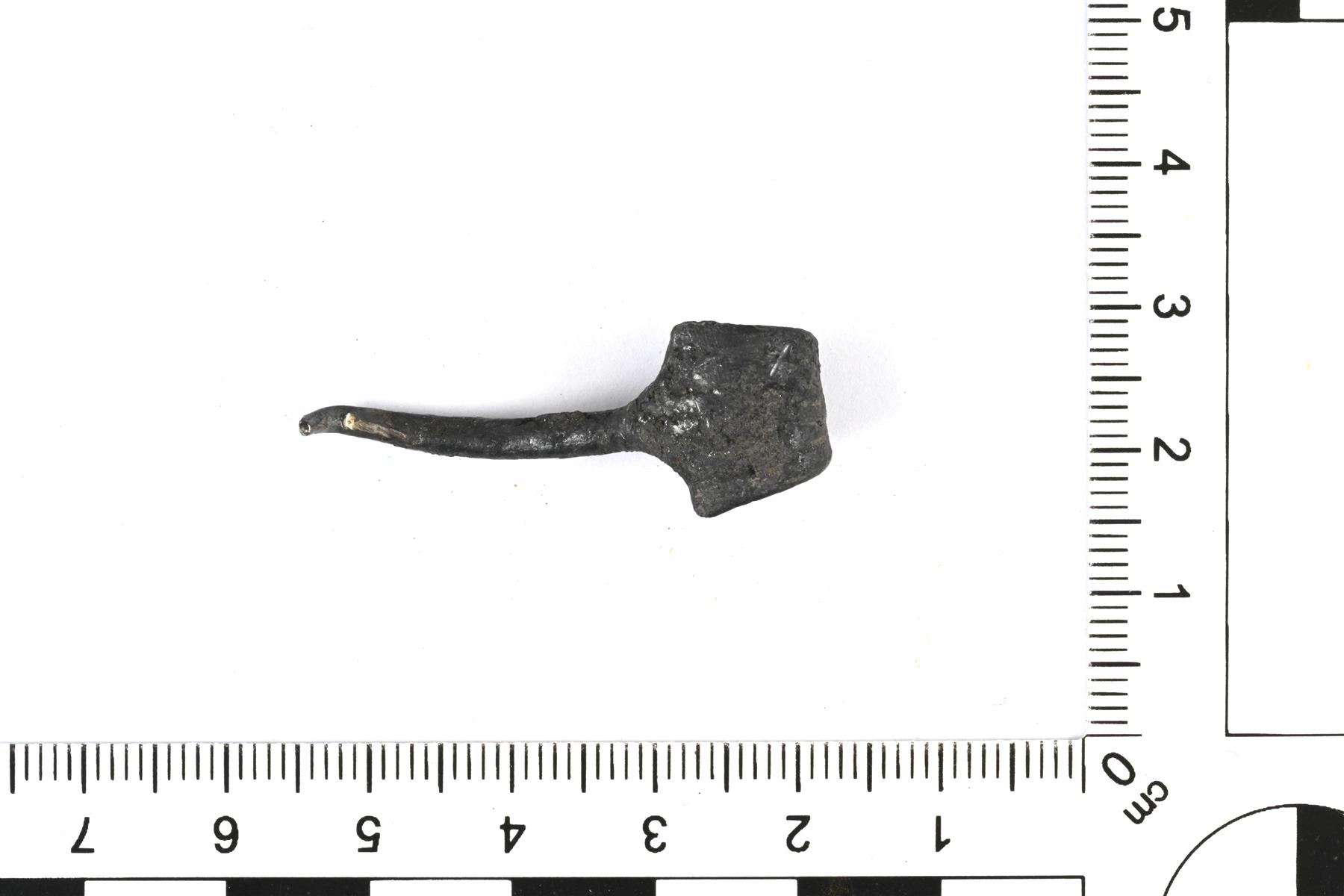 | Hevosenkenkäsoljen neula. Kantaosa on litteä levy, joka on taivutettu rullalle. Kannan koristeluna on viivauurteita. Pinnassa on vihreä patinakerros, mutta alkuperäistä hopeapintaa on paikoin nähtävissä. | |