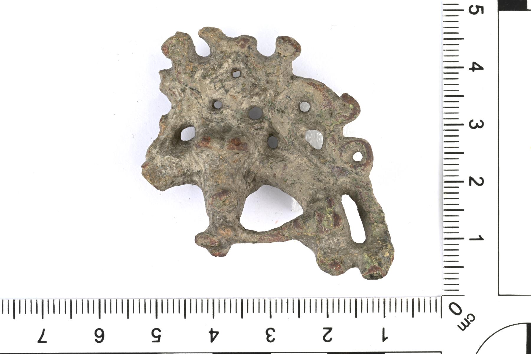 | Todennäköinen rengasneulan kehän katkelma. Koristeluna nauhapunoskuviointia sekä tyylitelty eläimen pää. Taustapuolella on neulan kiinnitystä varten kaksi rinnakkaista lenkkiä. | |