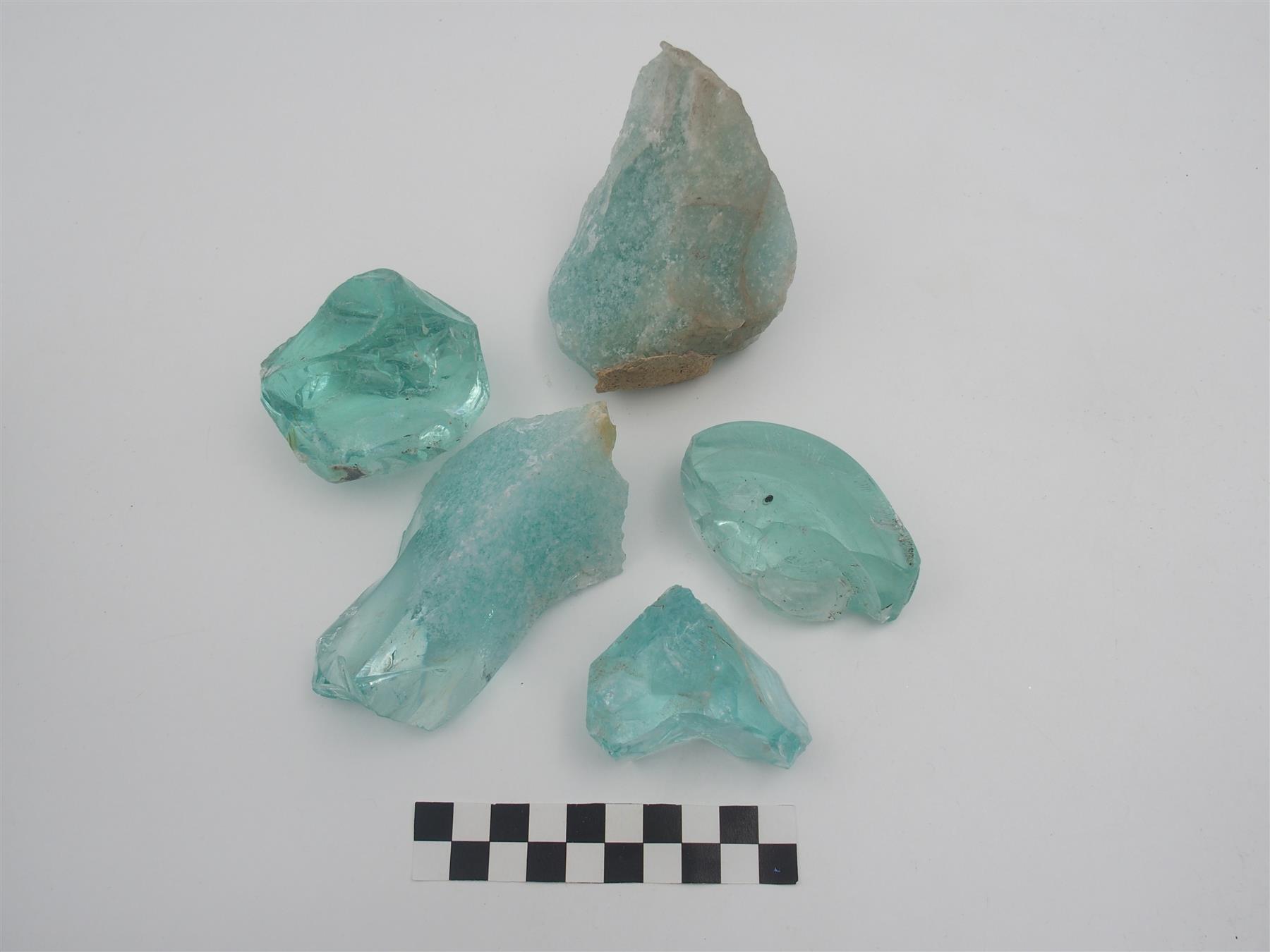 | Vaaleanvihreää raakalasimassaa. Joissain palasissa upokasta kiinnittyneenä. | |