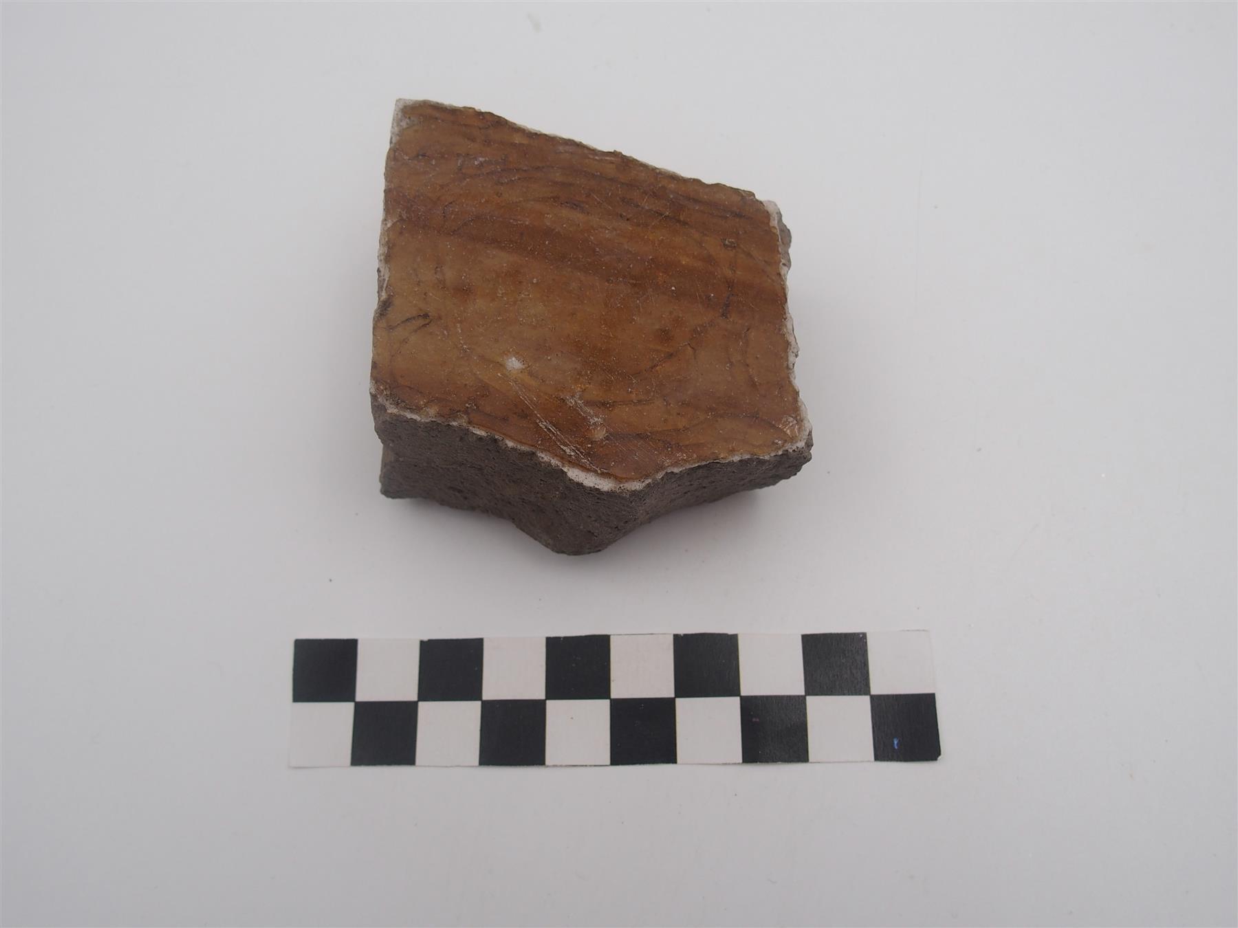 | Mahdollinen kaakelin tms. pala, jossa pinnalla koristeluna ruskeaa lasia. Massa harmaanruskeaa, melko huokoista keramiikkaa. | |
