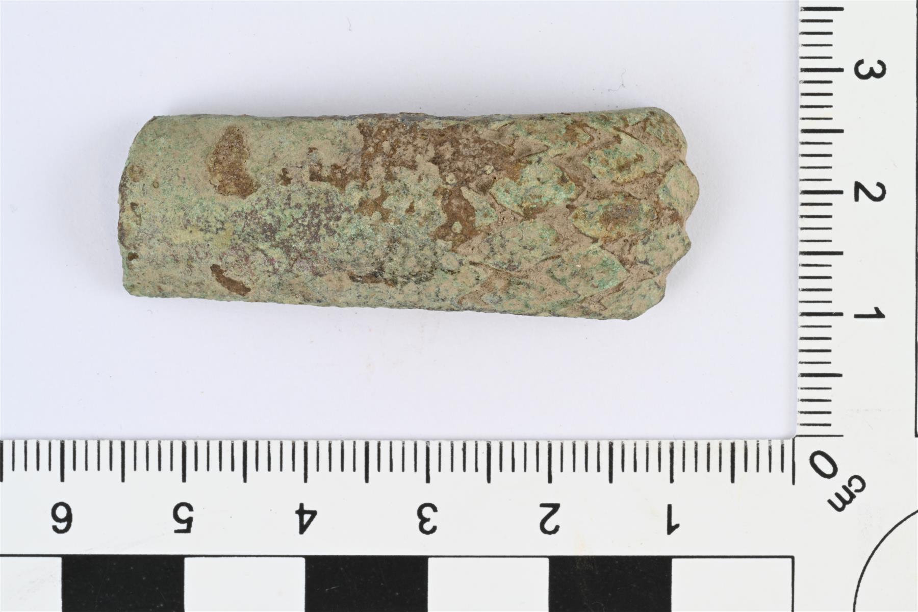 | Rannerenkaan katkelma. Molemmat päät katkelmalliset, kapenee hieman toiseen päähän. Poikkileikkauksessa ulkopinta kupera ja sisäpinta tasainen. Ulkopinnalla kulmaviivakoristelua, joka muodostaa pintaan vinoneliöitä. | |