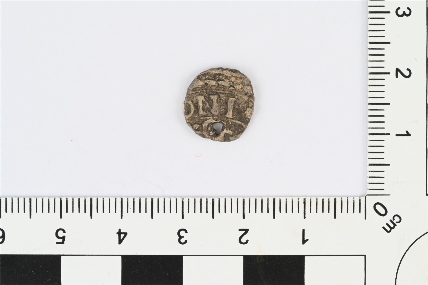 | Sinetin tms. katkelma. Pieni pyöreä levy, jonka toisella pinnalla reliefikuvioita, toinen pinta sileä. Reunassa pieni reikä. Koristellulla puolella katkelma selvästi suuremman ympyrän kehällä olevasta tekstistä ja kuvioinnista. Tekstistä jäljellä kirjaimet NI ja ennen niitä mahdollisesti O. Tekstin ylä- ja alapuolella kohovöitä, joista yksi nyörikuvioinen. | |