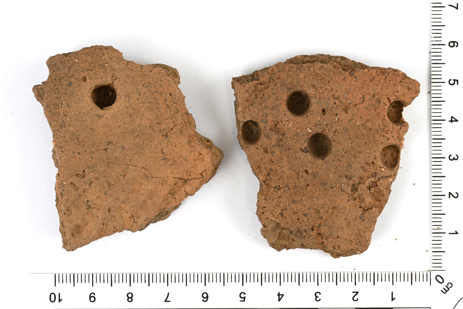 | Laatikosta 1. Kampakeraamisten astioiden kylki ja reunapaloja (2 kpl). Reunojen yläpinta on tasainen ja koristeltu kampaleimakuvioilla. Kyljissä on koristeluna kuoppia ja kampaleimakuvioiden muodostamia kenttiä. Astian palat ovat väritykseltään vaaleanruskeita ja pääosin hyvin poltettuja. Sekoitteena on pääosin hienoa kivimurskaa (1 mm ja alle), mutta joukossa on myös muutamia isompia iskoksia. | |