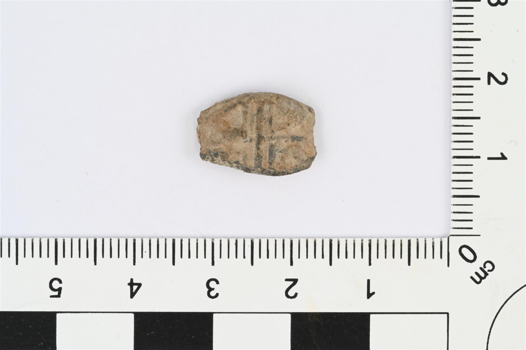 | Sormuksen kannan katkelma. Soikea kanta, jossa reliefikoristelua, mm. kannan keskellä kaksi pystyviivaa. | |