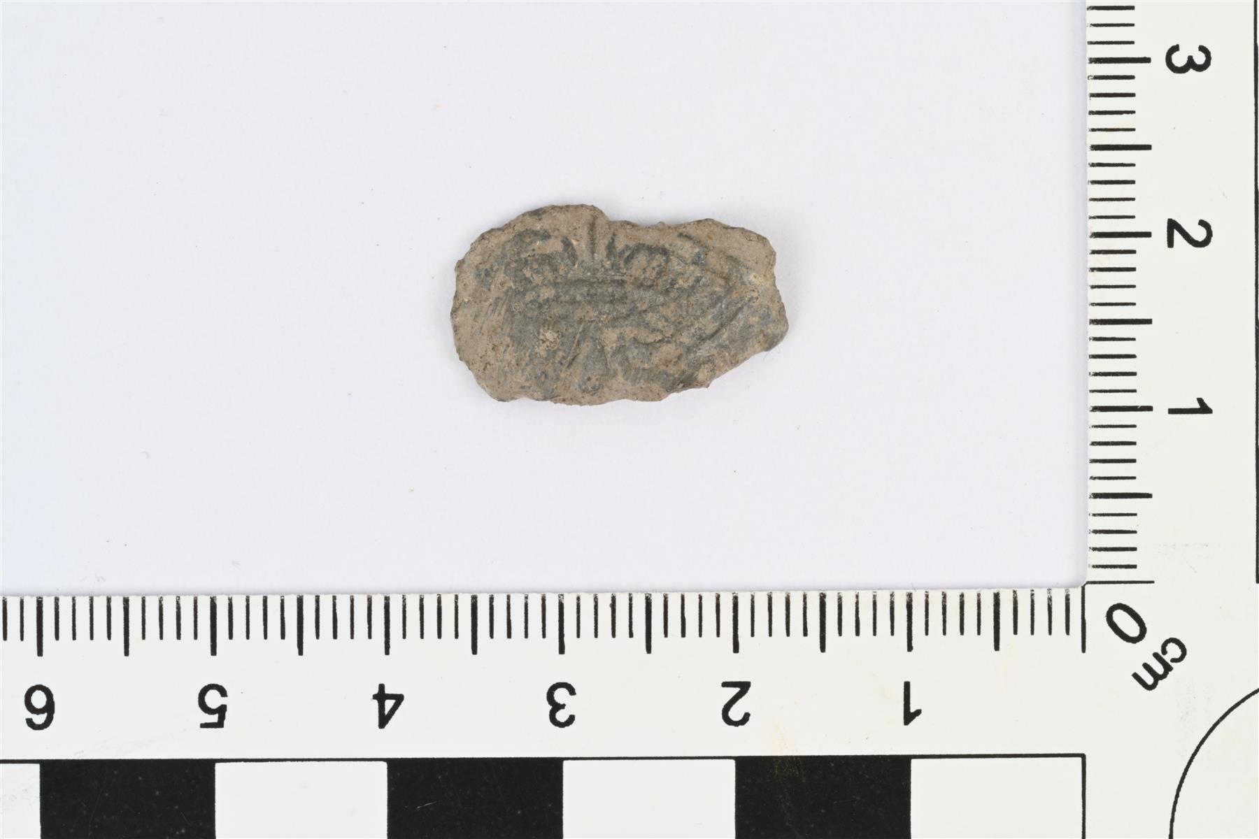 | Mahdollinen sormuksen kannan katkelma. Litteä pitkänomainen katkelma. Etupuolella viivoista koostuvaa reliefikoristelua. | |
